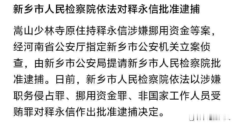 就在刚刚,释永信被批准逮捕了! 看了一下,这家伙,涉嫌了三个罪:职务侵占罪、挪用资金罪、非国家工作人员受贿罪! 我个人认为啊,释永信干了这么多年,涉案资金应该在是在数额巨大范围之内。也就是说每个罪起步是三年。三个罪数罪并罚的话,起步就是9年。 像他这样的人应该是会认罪认罚的,所以,检察院在量刑上估计会考虑减轻处罚,但,总体算下来最后法院判决在15年左右的样子应该是有的。 对此,你们怎么看?