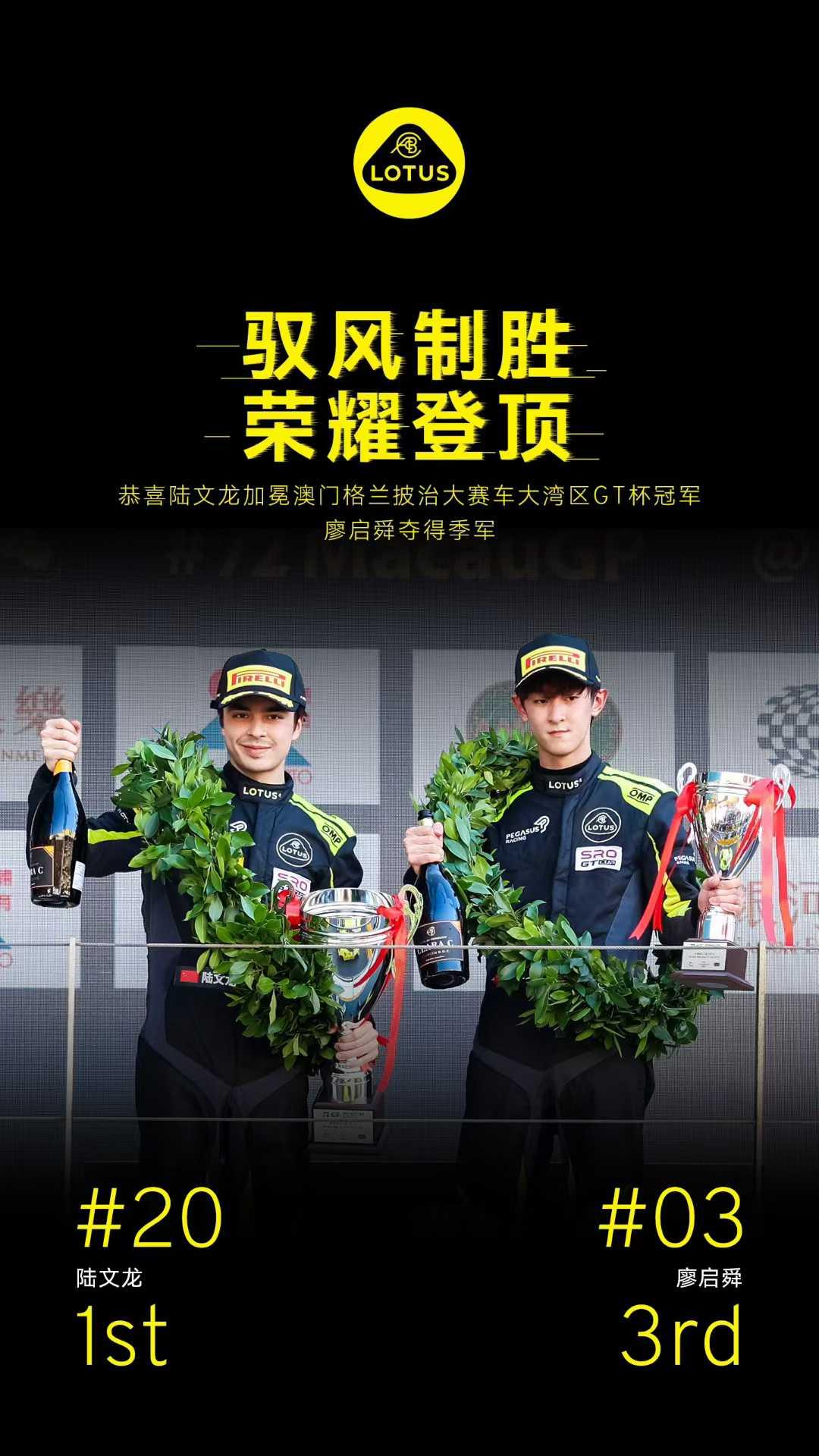 澳门格兰披治大赛车大湾区GT杯 恭喜陆文龙夺得冠军🥇 廖启舜夺得季军🥉 驭风荣耀加冕 赛道再续传奇! 莲花跑车