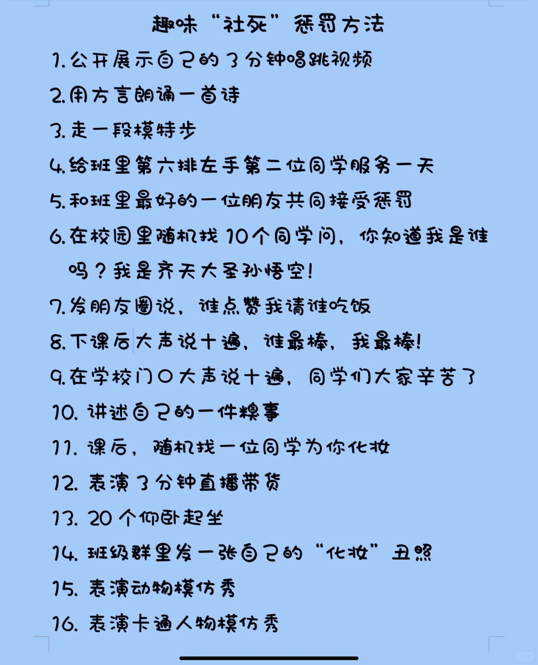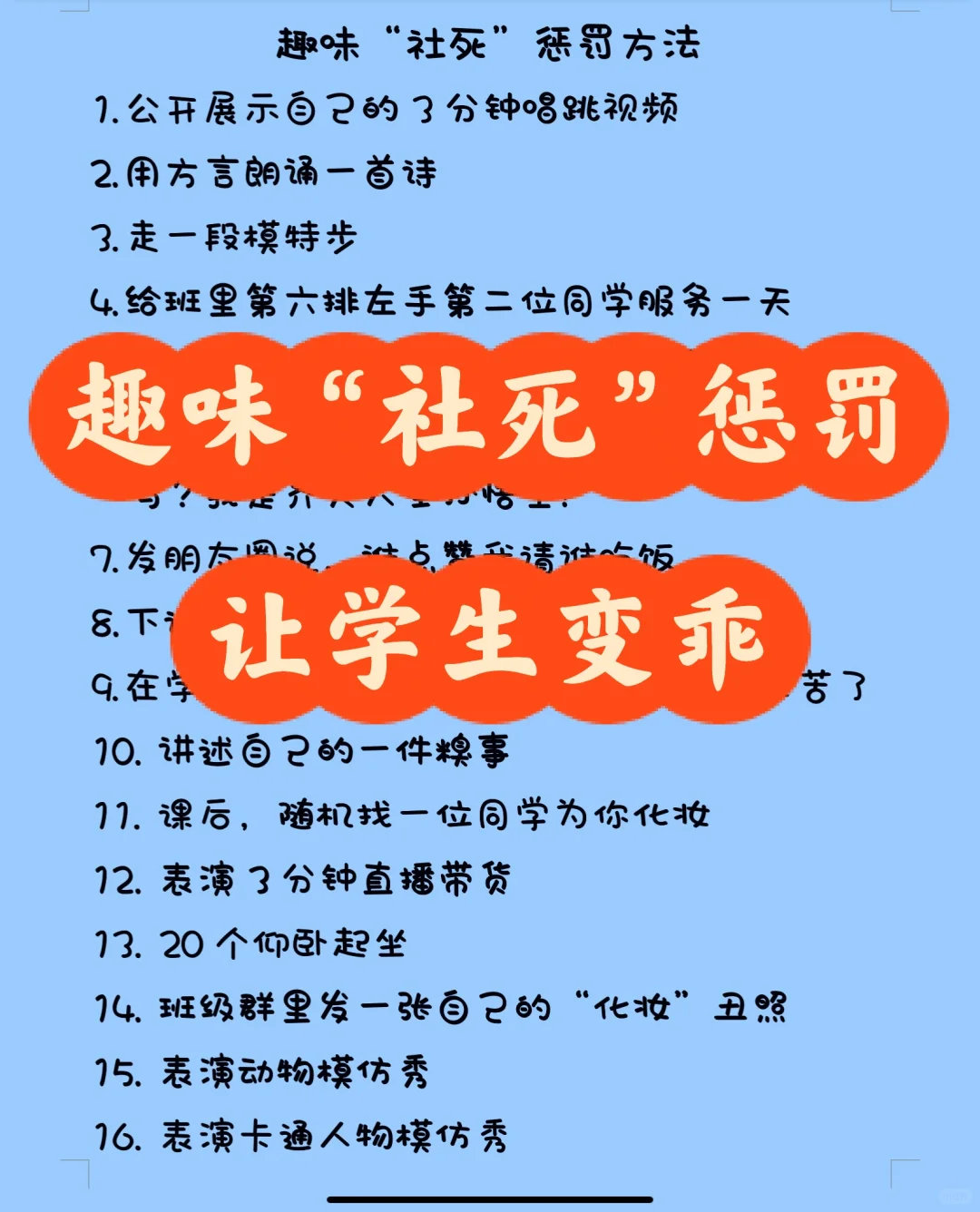宝子们!学生党专属的趣味社死惩罚来啦~ 唱跳3分钟、方言朗诵、给同学服务一天…还有模仿老师上课、班级群发丑照…哪个让你笑到跺脚?你敢试试哪个?