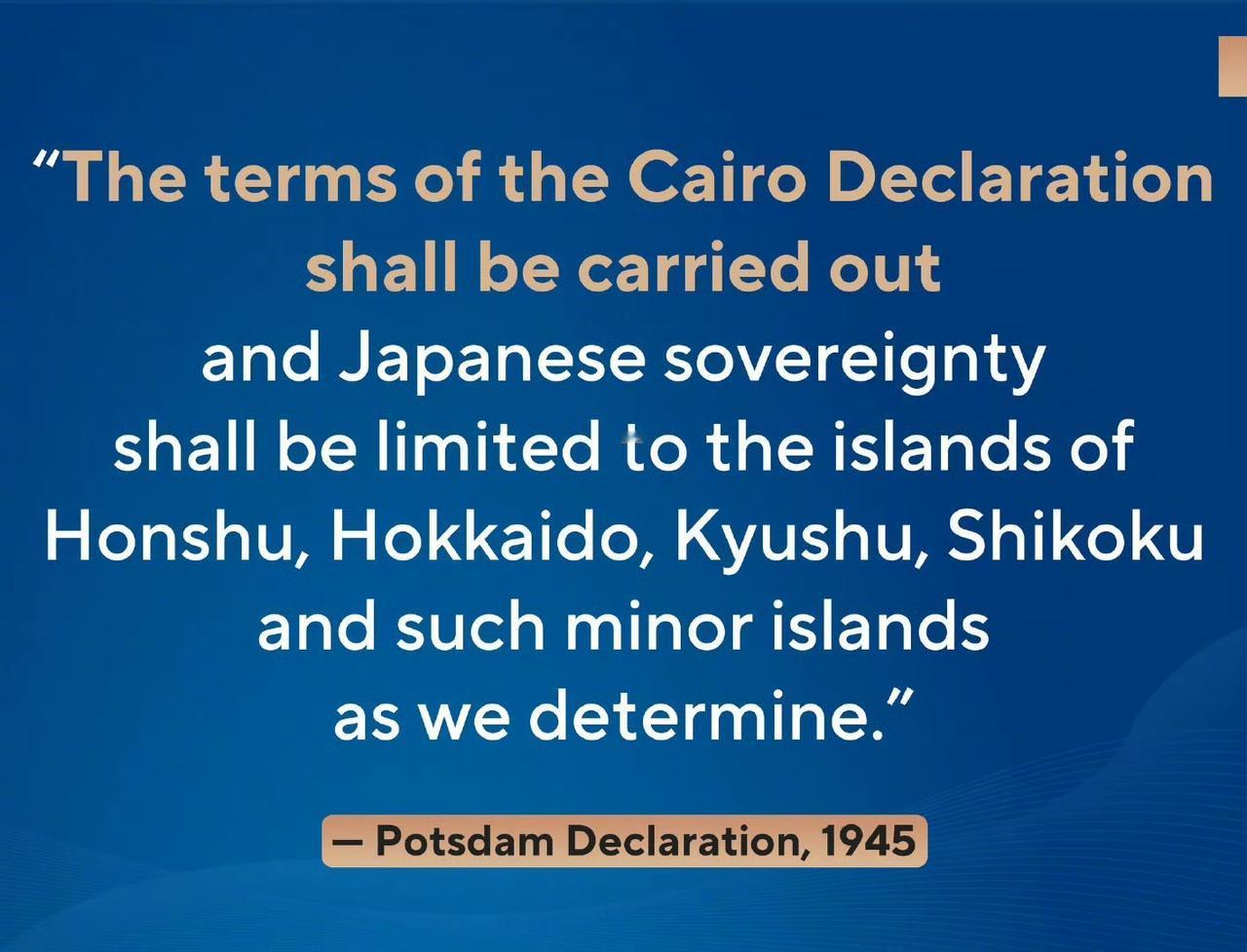 外交部发言人林剑X上发帖: “《开罗宣言》的条款应执行 日本的主权将仅限于本州、北海道、九州、四国和我们确定的小岛屿。” 中国爱好和平,但中国不畏挑衅,不惧战争,胆敢破坏中国的二战胜利成果,威胁中国核心利益,必须削它,忘战必危,如果敌人都打家门口的人还在那谈和平的,自缚手脚才会让中国危险。今天的生活是先烈们不断抗战牺牲生命换来的。 注:本文信息源于网络,内容仅为个人观点,无不良导向。