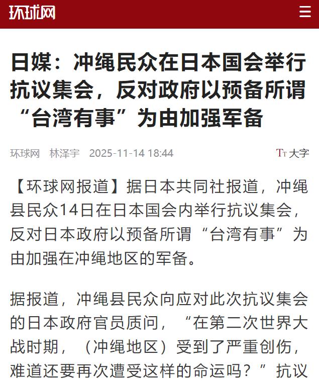 果然被我猜中了 日本方面宣布了! 11月14号,日本国会大厦里闹成了一片。冲绳的老百姓们涌进去举着标语喊口号,就为了反对日本政府借着“台有事”的由头,一个劲在冲绳加派武器、搞军备。 11月14号日本国会大厦里的那场喧闹,说白了就是冲绳人积压了上百年的委屈彻底爆发了,举着标语喊口号的每一个人,心里都装着一本算不清的血泪账,反对政府借着“台有事”的由头加派武器,不过是压垮骆驼的最后一根稻草。 毕竟这地方从根上就没被日本政府好好对待过,先是被强吞的亡国之痛,再是二战时被当炮灰的灭顶之灾,战后又成了美军基地的“集中营”,现在还要被捆上地缘政治的战车,换谁都得跳出来反抗。 要聊冲绳的命苦,得从琉球王国那会儿说起,人家本来是个独立的国家,跟咱们明清时期还保持着朝贡关系,商船往来频繁,日子过得也算安稳。 可日本明治维新后眼馋这片海域,1879年直接派兵占领,把琉球王国改成了冲绳县,从此冲绳人的好日子就到头了。 日本政府压根没把这里当自己人,而是当成掠夺资源的殖民地,当地传统习俗被强行禁止,连语言都要改成日语,这种文化上的压制,比抢地盘更让人难受。可这还只是开胃菜,真正的灾难在二战时铺天盖地袭来。 1945年的冲绳战役,成了当地人永远的噩梦,这场打了三个月的仗,把整个冲绳炸成了废墟。美军和日军在这里死磕,冲绳平民却成了最无辜的牺牲品,当时全县也就五十多万人口,战后统计下来,光平民就死了十四万,差不多每四个人里就有一个丧命,用户提到的88岁小岭达雄老爷子就是幸存者,10岁那年亲眼看着亲人被日本政府逼着“殉国”,那种失去所有亲人的痛苦,不是靠时间就能抹平的。 更让人寒心的是,当时日本军队为了所谓的“圣战”,给平民分发手榴弹让他们自杀,还编造美军会屠村的谎言,把老百姓往绝路上逼,这种由自己“国家”带来的伤害,比敌人的炮火更扎心。 本以为二战结束就能熬出头,没想到冲绳又成了美军的“自留地”。1972年美国把冲绳施政权还给日本,可却没把基地撤走,反而越建越多。 要知道冲绳全县面积才占日本的0.6%,却硬生生扛下了全日本70%的驻日美军基地,这些基地像补丁一样盖在冲绳的土地上,占了本岛18%的陆地面积,全是海边、平原这些好地段,当地想发展旅游业都没地方下手。 美军基地带来的麻烦更是没完没了,噪音污染成了周边居民的日常,2022年光是美军北部训练场周边,就测得三千多起噪音事件,大半夜的军机起降声能把人从梦里吓醒,长期生活在这种环境里,老人小孩根本受不了。 更要命的是安全问题,2022年一年,美军在冲绳就闹出54起刑事案件,比日本其他九个有美军基地的地区加起来还多,抢劫、伤人是常事,1995年三名美军士兵绑架强暴12岁小学女生的事,直接引发了几十万人的大游行,可就算这样,美军犯罪后还能靠着“治外法权”逃避惩罚。 交通事故也没断过,这么多年下来,美军车辆已经造成超过四千名冲绳民众死伤,去年还有架美军直升机在小学旁边坠毁,幸好是周末没学生,不然又是一场惨剧。 基地带来的不仅是安全隐患,更是经济上的拖累。冲绳的人均收入只有日本全国水平的七成,常年排在最后一名,按理说这么好的地理位置发展旅游业绰绰有余,可到处都是基地和军事禁区,游客来了连个干净的海滩都难找。 冲绳知事玉城丹尼算过一笔账,如果把美军基地占的土地拿回来搞开发,收入至少是现在的三倍,可日本中央政府根本不管这些,一门心思跟着美国搞军事部署。 当地民众的抗议从来就没停过,2023年9月日本最高法院驳回冲绳县政府反对新建基地的上诉后,七百多人连夜在那霸市集会抗议,还有人驾着橡皮艇闯进填海工地阻拦施工,跟警察发生冲突。 2021年更是有二十艘橡皮艇冲进工程限制区,就算被海上保安厅拦截,大家还是喊着“停止非法施工”不肯退让,这种反抗不是一时冲动,是常年被忽视后的必然爆发。 现在日本政府又借着“台有事”的名头往冲绳加派武器,在宫古岛、石垣岛这些离台湾只有几百公里的地方部署岸舰导弹,还要增派两千多名陆上自卫队士兵,明眼人都看得出来,这是把冲绳当成了地缘政治的前哨站,一旦真有冲突,冲绳肯定是第一个挨打的。 日本政府在本土搞和平宣传,却把冲绳人往火坑里推,这种双重标准谁能接受。小岭达雄老爷子现在还会给年轻人讲当年的惨状,就是怕大家忘了被当炮灰的滋味,可日本政府根本不管这些,眼里只有跟美国的军事同盟。 冲绳民众心里跟明镜似的,加派再多武器也不是保护他们,而是把他们绑在战车上,之前的历史已经证明,真到了关键时刻,他们永远是被牺牲的那一个。