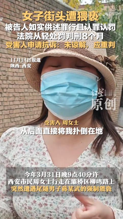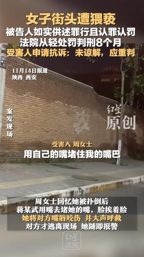 “严查到底!”2025年3月,陕西西安,一女子逛街时,被陌生男子从后方抱住,一边强吻一边脱她裤子,女子虽奋力反抗,但是被对方牢牢摁在地上,情急之下,女子咬破了男子嘴唇,男子吃痛后退,这才让女子抓住机会逃脱!法院:获刑8个月。   西安3月底的晚上还沾着点没散干净的春寒,晚上的纺织城柳鸣路,路边麻辣烫店的抽油烟机还嗡嗡转着,奶茶店门口堆着几个刚被踩扁的外卖袋,周女士把羽绒服的帽子往头上一扣,盯着手机里的小区门禁码,心里数着“再走一百五十米就到家”,压根没留意身后那个穿灰色连帽衫的男人,已经跟着她转过了两个红绿灯路口。   谁都没想到,热闹的街边会突然变成让人发冷的“险境”,就在周女士刚走到一家水果店门口,后背突然被一股力气猛地一拽,整个人结结实实摔在人行道的地砖上,后背的疼还没散开,一个带着酒气的身体就压了上来。   一开始周女士以为是喝多的熟人闹着玩,直到对方的嘴凑到她脸上,一只手开始拽她牛仔裤的拉链,她浑身的汗毛瞬间竖了起来:“不是认识的人!救命!”   她的胳膊被对方死死摁在地上,挣扎的时候右手蹭到地砖,磨出了几道红印子,眼看对方的动作越来越过分,周女士咬着牙,朝着凑到眼前的男人嘴唇狠狠咬了下去,“咔嚓”一声,嘴里瞬间尝到血腥味,压着她的男人“嗷”地叫了一声,手一松往后退了半步。   周女士抓住这个空当,连滚带爬地往水果店门口跑,店里的老板听见动静冲出来,那个男人一看有人过来,转身就钻进了旁边的小巷子,缓过神的周女士立刻报了警,警察不到十分钟就到了现场。   经过调取监控看到,画面里穿灰色连帽衫的蒋某某(29岁)从纺织城地铁站B口出来后,就在路口晃悠了五分钟,看到独行的周女士后,悄悄跟在她身后120多米,直到水果店门口才动手。   第二天下午,警察就在蒋某某的出租屋里找到了他,他嘴唇上的伤口还没结痂,面对周女士咬下来的血迹DNA比对结果,他承认自己当天喝了半斤白酒,临时起了歹念。   之后的几个月里,周女士的日子过得“拧巴”:右边胳膊的肌肉拉伤养了一个多月,晚上一闭眼就是被摁在地上的画面,经常凌晨两三点吓醒,医生诊断她是急性应激障碍,开了助眠药,她还退掉了原来离事发地两百米的出租屋,搬到了公司附近的合租房,“现在看到穿灰色连帽衫的男人,都会下意识往旁边躲”。   最近周女士拿到了西安市灞桥区人民法院的判决书:蒋某某犯强制猥亵罪,判处有期徒刑8个月,赔偿周女士医疗费944.43元,但周女士觉得,对方的行为不止是“猥亵”,对方有脱裤子的动作,明显是想实施强奸,只是因为自己反抗才没成功,她已经向检察院提交了抗诉申请,“我不是要‘报复’,是想让他的行为得到对应的定性”。   这件事在网上传开后,评论区里炸开了锅:   有网友敲着字说:“谁再说‘闹市区很安全’我跟谁急!麻辣烫店就在旁边,奶茶店还有人排队,坏人照样敢动手,女生真的不能掉以轻心”;   还有学法律的网友解释:“强制猥亵和强奸未遂的核心区别是‘主观目的’和‘行为推进程度’,周女士的抗诉需要更多证据,比如对方是否有提前准备、行为的持续时间,这也是法律严谨的地方”。   这件事其实戳中了好多人心里的“安全神经”:首先,危险从来不分“地点”,哪怕是灯光明亮、有人流的闹市区,也可能藏着临时起意的恶意,走路别只顾着看手机,留一点注意力在周围环境上真的很重要。   其次,遇到危险时的“有效反抗”比“乱挣扎”有用,周女士没盲目推搡,而是瞄准对方的嘴唇咬下去,既让对方停手,又留下了最直接的DNA证据,这成了警察快速破案的关键。   最后,心理创伤不是“矫情”,周女士的失眠、回避路线,都是真实的伤害,遇到这种事别硬扛,找医生、找家人帮忙,比自己憋着强太多。   那么你们怎么看待这件事呢?欢迎在评论区说说你们的看法吧!
