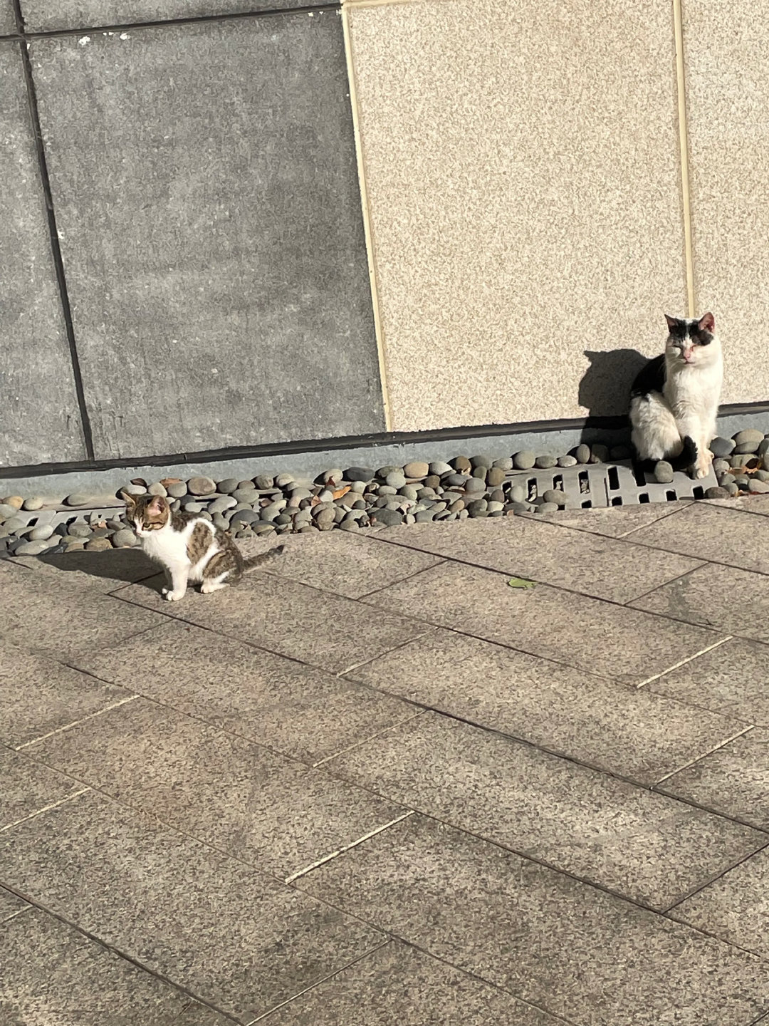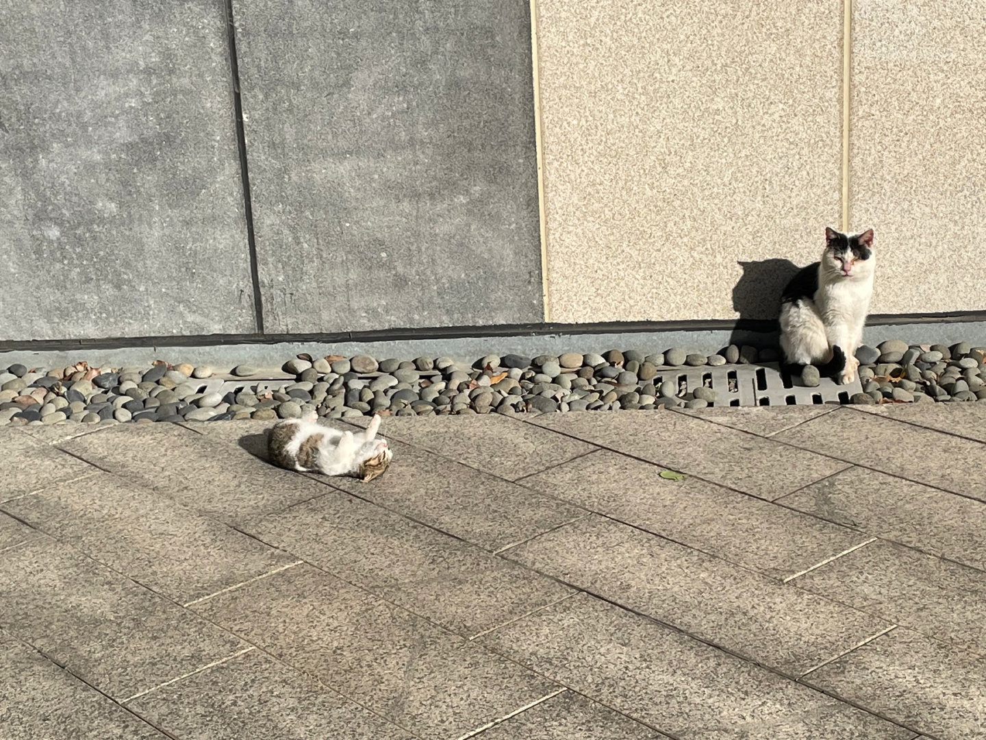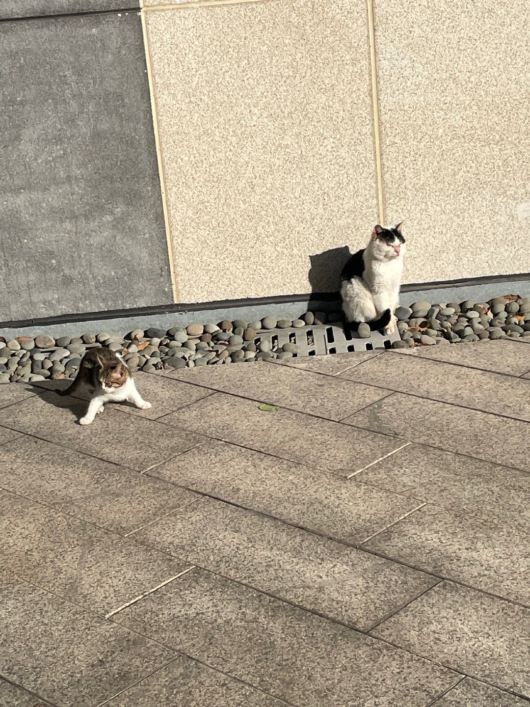 公司楼下遇到这俩在晒太阳的小猫。一大一小,大的安安稳稳的面对着太阳眯着眼,享受着阳光。小的猫可就没这么安稳了,一会趴地上打滚。一会摆出进攻的姿势四处张望。我停下来观望了他俩好久,他俩显然对我一点都不怕。毫不在意我的存在。可能生命诚宝贵,(新鲜的)阳光价更高吧。我觉得他们比我幸福。[吃瓜群众]
