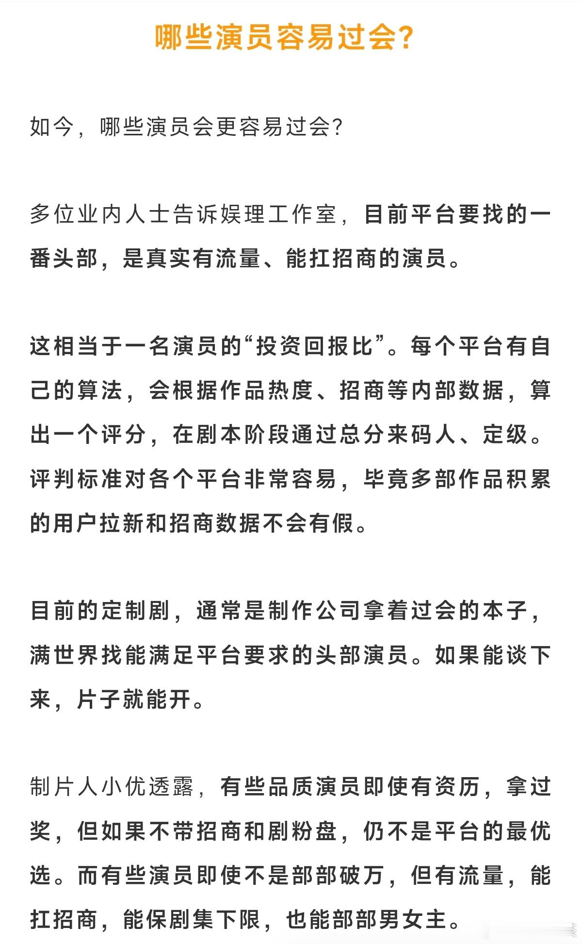 “除了几个顶级流量,目前通常是双人过会,比如头部演员带个头部导演或头部编剧。说白了,能过会的项目必须有特别长的长板,要不看收入,要不赚吆喝,只有双强组合才能提供这个预期。”