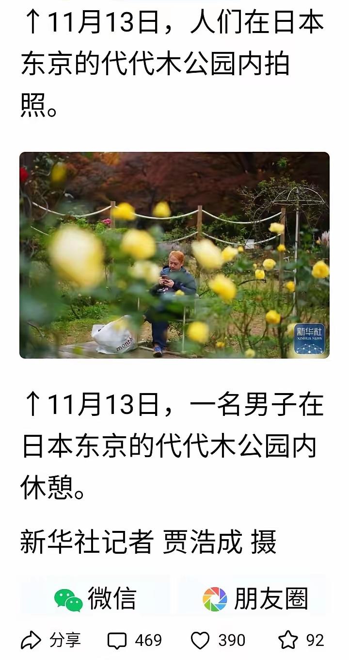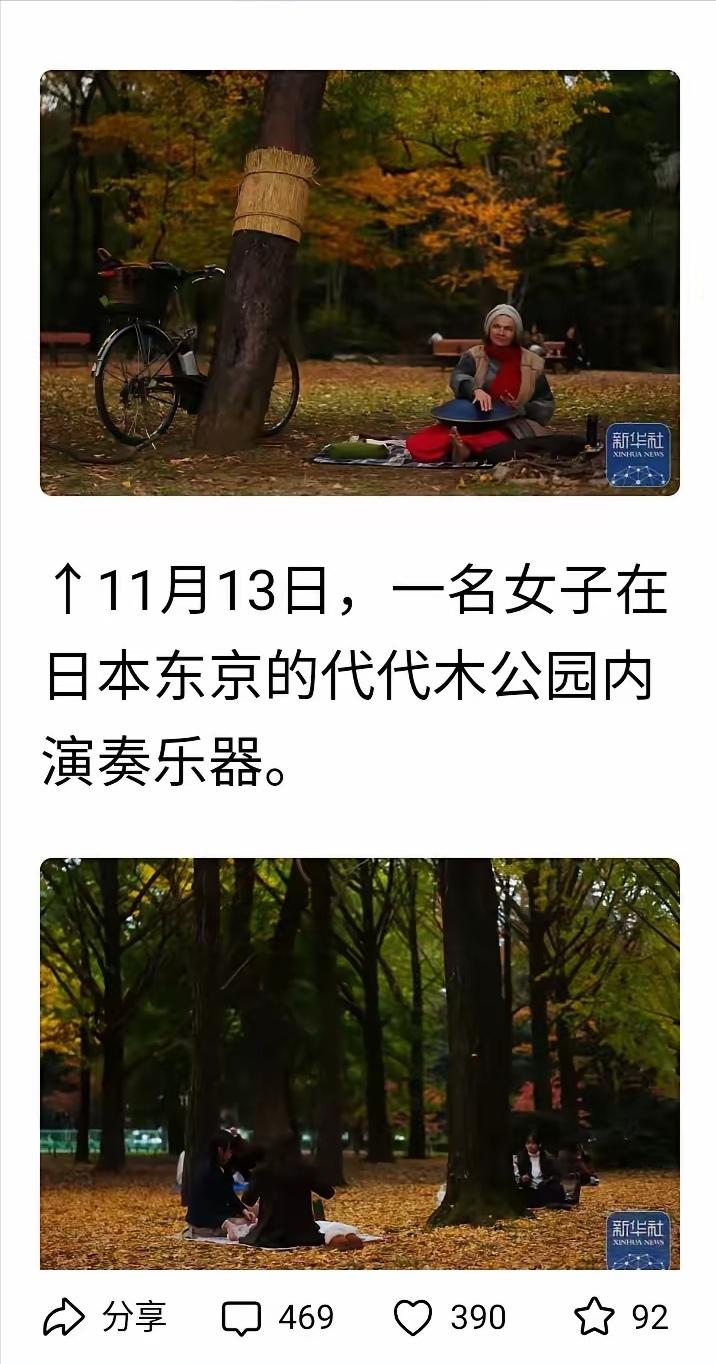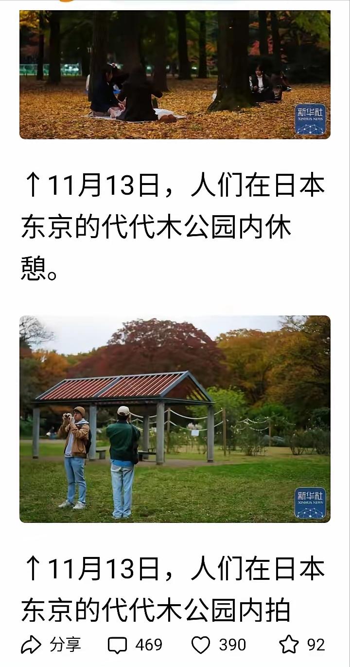 新华社突然了一组日本东京代代木公园的图片,有啥含义吗? 高市早苗的言论,引起了咱们全体中国人民的愤怒,大家都在批斗这位刚上任不久的日本首相的言论。 11月13日,新华社突然发了一组日本东京代代木公园的图片,其含义真是让人费解! 标题是:东京:秋意盎然。第一张图片是一个人在公园里遛狗;第二张图片是一个妇人在公园里弹着乐器;第三张图片是几个游人在公园里休息;第四张图片是两个游客在公园里拍照;第五张图片是一个男子在公园里休息。 也许是我多想了,但我是真的没看懂新华社发这几张图片到底是啥意思?