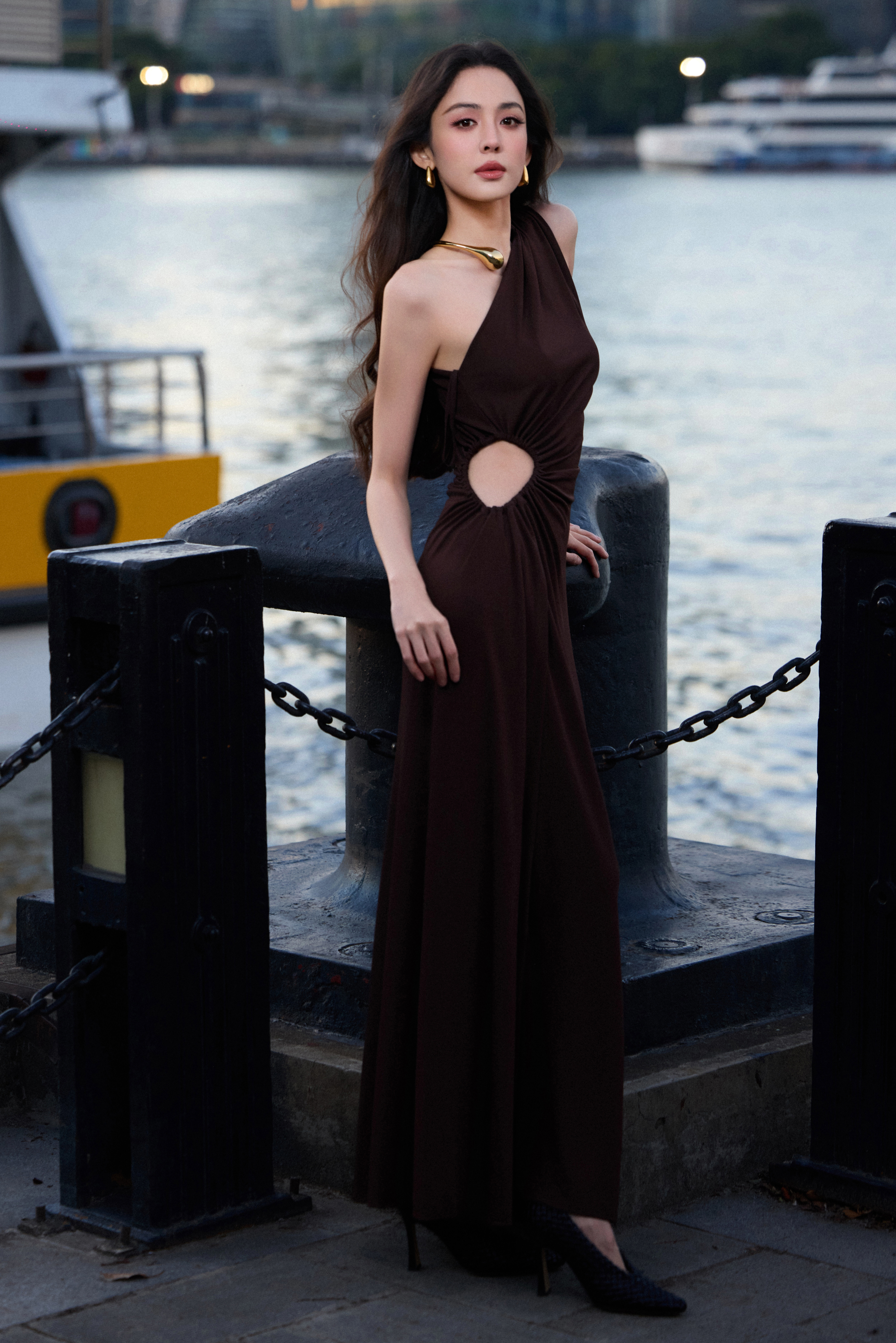 古力娜扎 深棕裙装勾勒出从容的轮廓,暮色里的她自带松弛而舒展的高级感。
