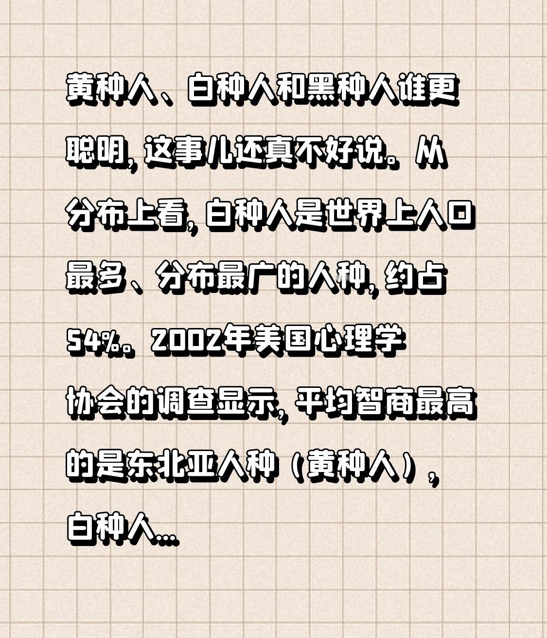 黄种人、白种人和黑种人谁更聪明,这事儿还真不好说。 从分布上看,白种人是世界上人口最多、分布最广的人种,约占54%。2002年美国心理学协会的调查显示,平均智商最高的是东北亚人种(黄种人),白种人排第二。从进化学角度,黄种人是进化最完整彻底的人种。 不过,白种人凭借历史上的殖民扩张积累财富,控制全球产业链高端环节,掌握着国际话语权。黄种人虽然聪明又勤劳,工作投入精力多,但在国际竞争中,因话语权差异,要付出更多才能获同等回报,生育率也是所有人种里最低的。所以,不能单纯以某个标准评判谁更聪明,各有各的优势和发展轨迹。