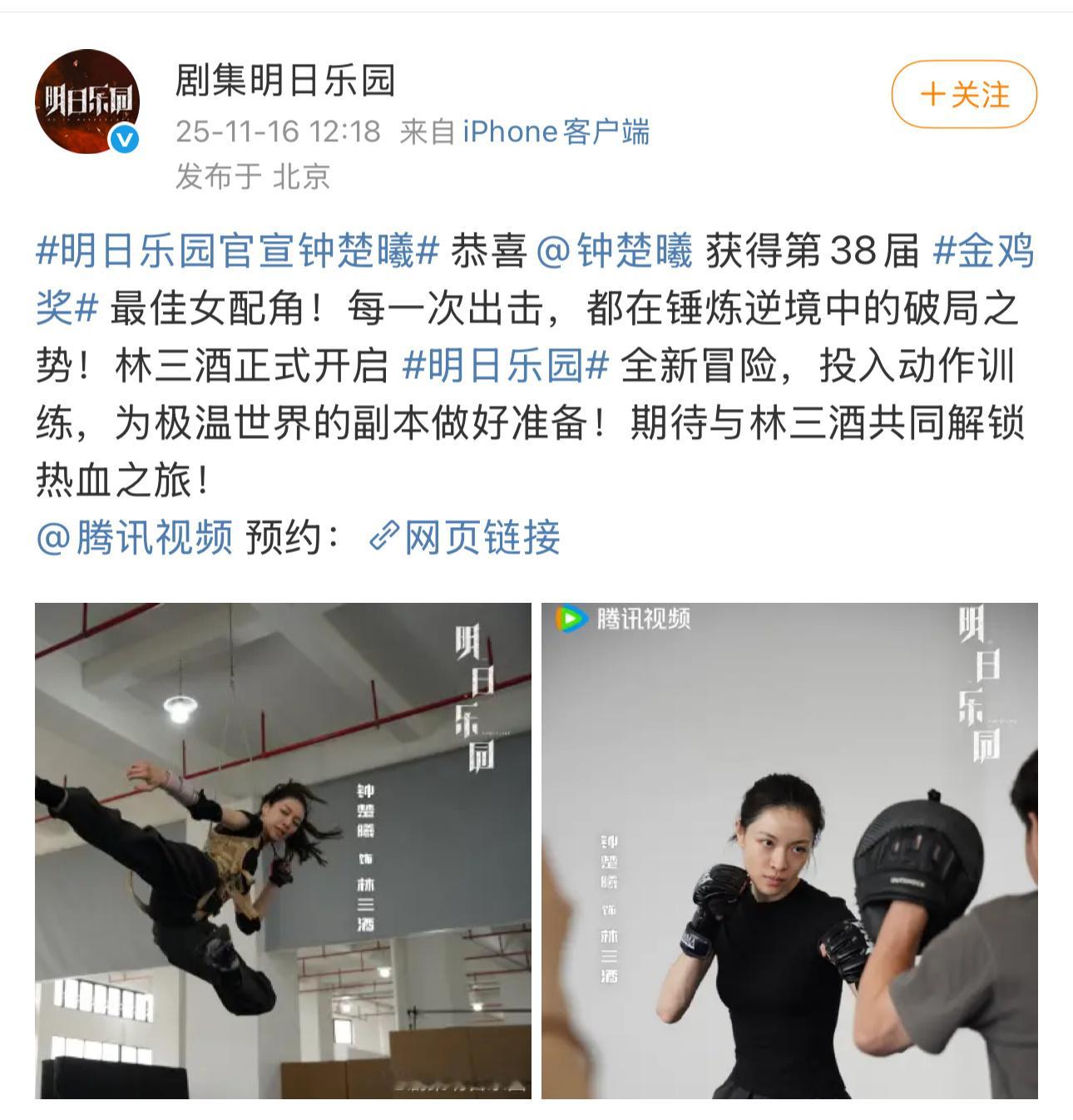 趁着金鸡奖的热度,剧集明日乐园官宣了钟楚曦