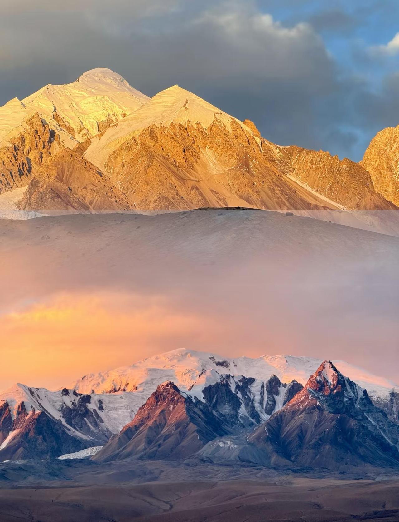 我在去塔县的路上拍到了日照金山!🌄 从喀什自驾去塔县的这一路,把“幸运”两个字焊在了脸上!南方人直接被雪山暴击到失语,这一路的美景真的值得N刷! 早上10点从喀什出发,沿着中巴友谊314国道一路向帕米尔高原冲,过边防站时还意外喝到了暖心的“警茶”🍵(p3-4)虽然接着就被J车压道了hhh 第一站打卡白沙湖北岸(p5-7),北岸人少不要门票,雪山场景震撼,缺点就是白沙会比较远,这个看个人喜好取舍,当地人都觉得差不多,所以我们选择返程经过了一下南岸(p8)简单拍了几张,我提前在联系了当地小哥拍了北岸的航拍,虽然秋冬着装裹得有点臃肿,人物出片率不如夏天,但雪山湖泊的壮阔感完全没打折扣!原片质量一般就不推荐了,但自己会修图的话留作纪念,性价比还是🉑的 接着冲了木吉火山口(p9-10)!最幸运的是当天万里无云,能见度直接拉满,十八罗汉峰的轮廓清晰到不像话(p2上) 到达塔县前的傍晚时分更是收获了意外之喜!在路边偶遇绝美的慕士塔格峰日照金山🌄(p1),夕阳把雪山之巅染成金红色,连绵的雪峰在暮色中格外震撼,司机说这一路都是可遇不可求的美景!幸运值爆棚,314国道真的美到窒息,一路雪山含量高达80%,车窗全程没关上,顶着冷风狂按快门,本南方人也是过足了雪瘾[偷笑]到塔县后还炫了牦牛火锅(就是跟上海物价差不多了…) 第二天直奔慕士塔格峰4号冰川(p12-17),作为新手友好型冰川真的没踩雷!坐区间车到起点,只需爬1.8公里左右就能登顶(也可以选择骑马),我这种运动小白抱着氧气瓶慢慢挪,居然也成功打卡了~ 不过最近冰川顶部打卡点在修缮步道,施工现场拍照比较难看,只能找找角度了。 幸运巅峰是当我们拍完照刚准备下山时,山顶瞬间乌云密布、狂风降雪,下山后整个山区已经被大雪覆盖(p18),大雾弥漫,“冰山之父”彻底隐身,这运气真的没谁了 喀什到塔县 帕米尔高原 314国道 慕士塔格峰 白沙湖 木吉火山口 新疆旅行 南疆旅游 自驾旅行