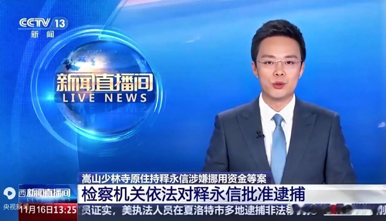 央视新闻官宣嵩山少林寺原住持释永信被新乡市检察院批捕,涉职务侵占、挪用资金等三罪。案件由新乡公安立案侦查,最高检确认依法办理。