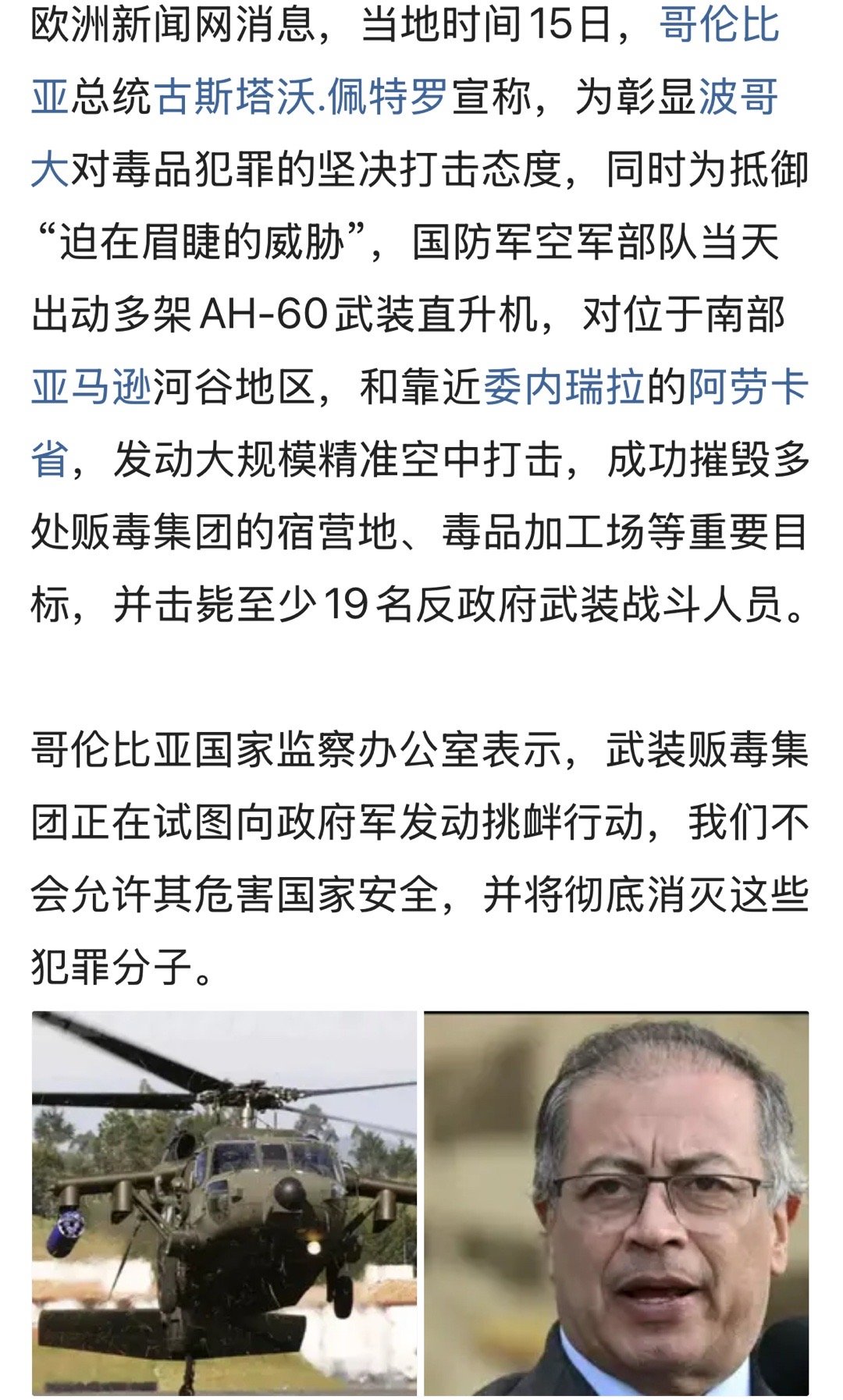 😐哥伦比亚国家监察办公室表示,武装贩毒集团正在试图向政府军发动挑衅行动,我们不会允许其危害国家安全,并将彻底消灭这些犯罪分子。
