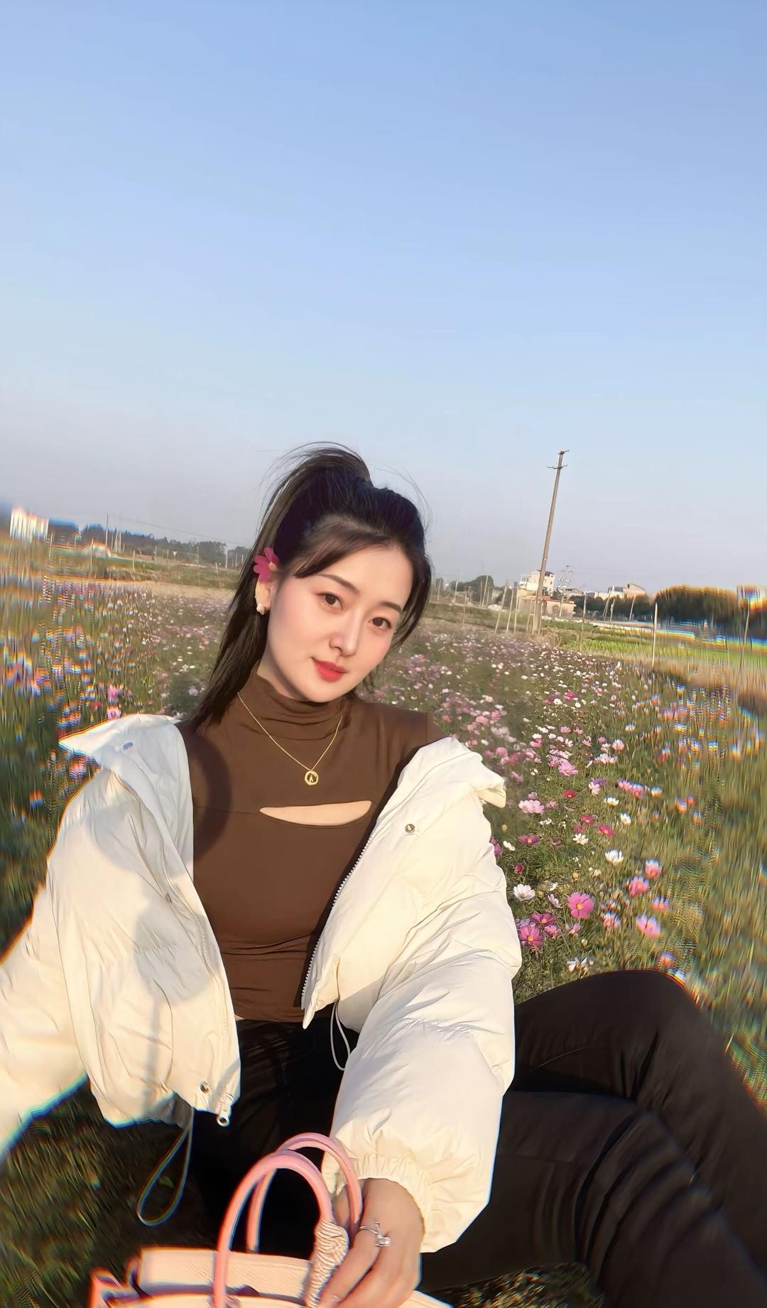 黑裙少女静坐花丛,悠然自得,享受自然之美。