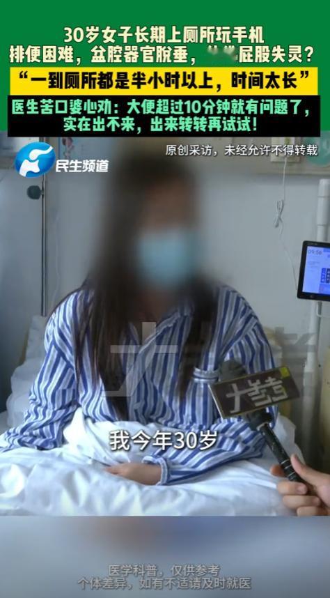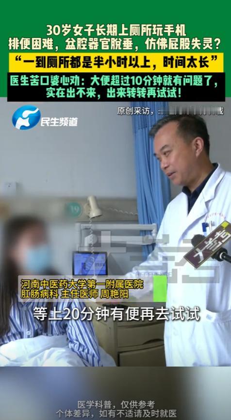 厕所里的健康警钟 “悲剧还是发生了!”河南郑州,一女子长期上厕所时玩手机,一蹲就是半个小时 女子姓周,32岁,是家广告公司的文案,手机里存着十几个短视频APP,上厕所成了她最“专注”的刷手机时间。 她总说“蹲坑不刷手机,比上班还难熬”,往往是手机一揣进兜里就往厕所冲,蹲在马桶上点开推送,不知不觉就忘了时间。 一开始是十几分钟,后来刷到精彩的剧情或搞笑段子,半小时都算短的,腿麻了就换个姿势,直到手机没电或刷不到新内容才肯起身。 每次站起来都要扶着墙缓半天,脚底板又麻又胀,像踩在棉花上,她总笑着跟同事说“这是带薪放松的代价”,从没当回事。 变化是从半年前开始的,她发现自己排便越来越费劲,蹲到腿酸也没动静,不用开塞露的话,一周都排不出一次。 更让她慌的是,下腹部总像坠着块石头,走快了还会有轻微的坠胀感,甚至出现了排尿频繁的情况,夜里要起好几次夜。 上周三早上,她蹲了40多分钟仍毫无结果,起身时突然眼前发黑,直直摔在卫生间地砖上,额头磕出了淤青。 被家人送到郑州市中心医院后,妇科医生张主任的检查结果让她瞬间懵了——中度盆腔器官脱垂,膀胱和直肠都有轻微膨出。 “你这盆底肌早被‘蹲’废了。”张主任指着B超报告,手指点在盆底肌肌力数值上,“正常是4级,你才1级,跟生完孩子没恢复好的产妇一样。” 周女士攥着衣角,小声说“就是上厕所爱玩手机”,张主任无奈地摇头,“马桶上的半小时,比干重活还伤盆底。” 她解释说,人蹲着时腹部压力比站立时高3倍,长时间保持这个姿势,盆底肌就像被拉长的橡皮筋,慢慢失去弹性,托不住内脏就会往下掉。 《盆底功能障碍性疾病诊治指南》里明确写着,长期如厕超过10分钟,就是盆底肌损伤的高危因素,比便秘本身更伤身体。 周女士这才想起,半年前就有同事提醒她“别蹲太久”,可她总觉得“大家都这样”,直到现在需要每天做盆底肌修复训练,还要配合电刺激治疗。 她的主治医生把病例发到医院科普号上,评论区立刻炸了锅,有网友说“我蹲厕所必带手机,刷到腿麻是常态,现在赶紧站起来活动活动”。 还有位护士留言,“上周刚收过一个28岁的姑娘,情况比她还严重,也是厕所刷手机的‘忠实粉丝’,现在做手术花了两万多”。 张主任在后续的科普直播里强调,健康如厕时间应该控制在5分钟内,实在没便意就先出来,别硬蹲,更别带手机“催生”。 周女士现在把手机放在卫生间外的置物架上,每次上厕所都盯着墙上的挂钟,她说“虽然有点无聊,但摸不到手机,真的能快很多”。 你上厕所时也会忍不住带手机吗?一般要蹲多久呀? 信源:大参考2025-11-12——河南郑州,30岁女子长期上厕所玩手机,排便困难,器官脱垂,仿佛屁股失灵?"一到厕所都是半小时以上,时间太长”,医生苦口婆心劝:大便超过10分钟就有问题了,实在出不来,出来转转再试试!;《盆底功能障碍性疾病诊治指南(2024版)》;郑州市中心医院2025年健康科普案例。