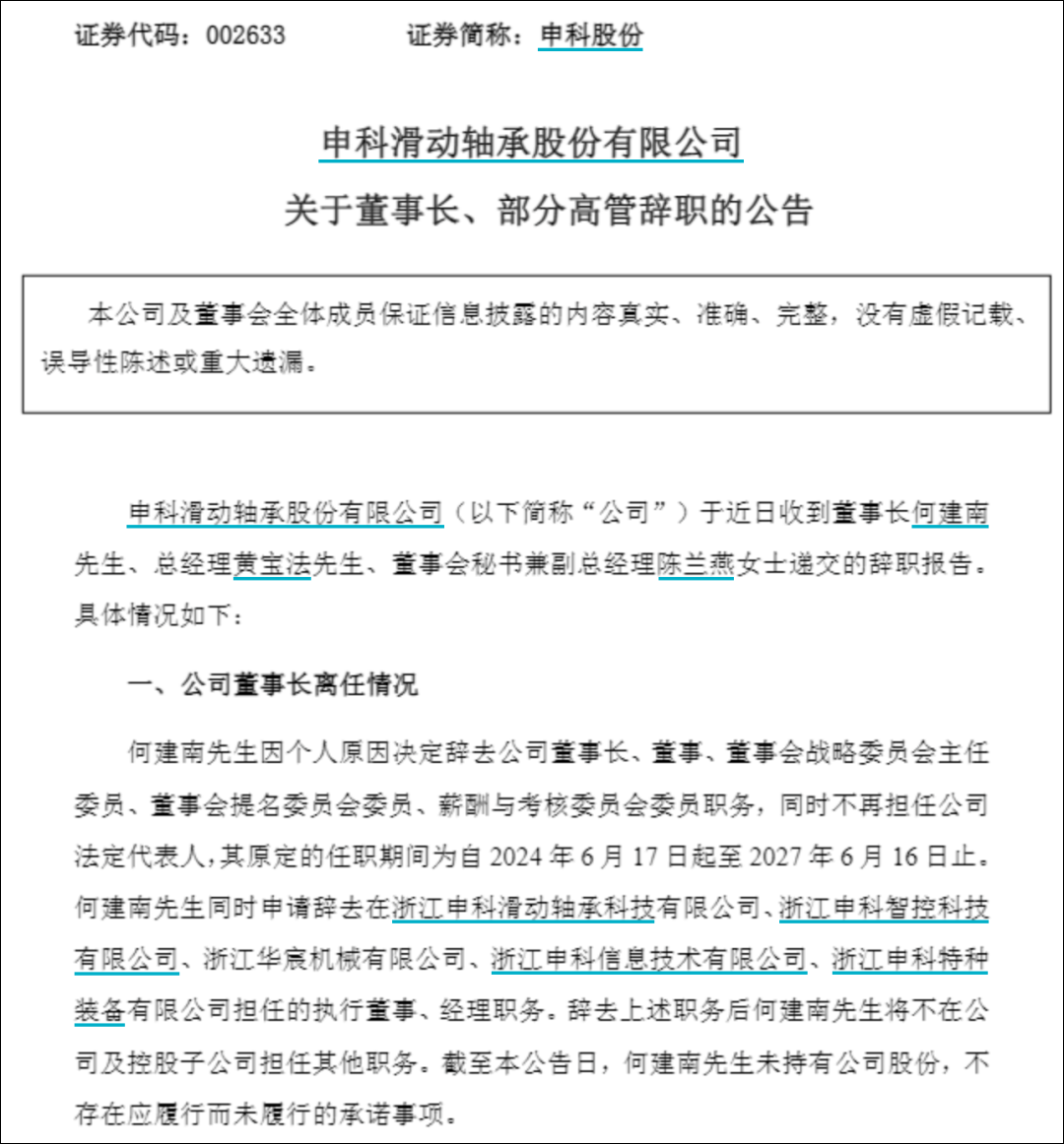 同时,何建南申请辞去在浙江申科滑动轴承科技有限公司、浙江申科智控科技有限公司等担任的执行董事、经理职务。辞去上述职务后何建南将不在公司及控股子公司担任其他职务。