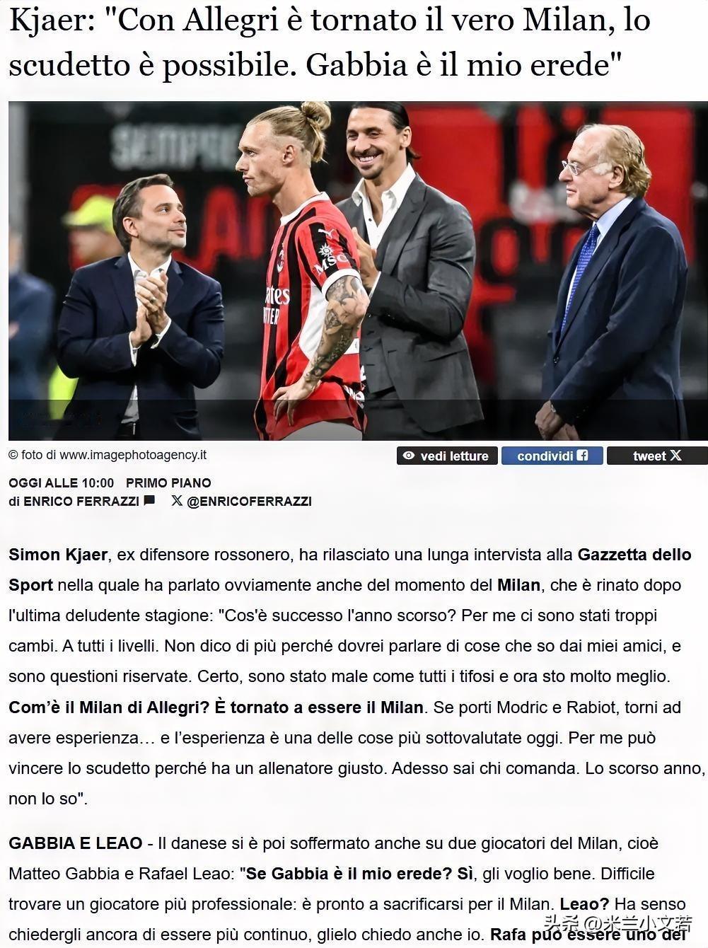 克亚尔!丹麦老父亲克亚尔接受采访表示加比亚现在的表现十分出色,他具备一线豪门主力的能力,他是一名十分出色的后卫球员,能完美替代我离开米兰后的空缺。 丹麦老父亲克亚尔说我是在9月才得知米兰不会与我续约的,当时做出退役决定不是一时冲动,也不是对什么不满,我是出于家庭和发展等综合考量做出的决定,我可以放心离开米兰,因为我清楚米兰有一位十分出色的替代者,加比亚具备成为任何豪门主力球员的能力,他现在做的非常好,相信在阿莱格里的带领下他会越来越出色,同样我也相信阿莱格里会带领米兰赢得联赛冠军。 资本对待丹麦老父亲做的事情我们都明白,他们觉得克亚尔老了,伤病影响了他的竞技状态,但资本都是健忘的他们忘记了克亚尔为什么而受伤,他为啥状态恢复不到巅峰水平,当然最重要的是他们永远不懂什么是经验传承,一个经验丰富的老后卫到底对一支球队有多重要。幸亏来了阿莱格里,他善于调教防守球员,否则无论加比亚还是帕夫洛维奇都很难有今天的表现。