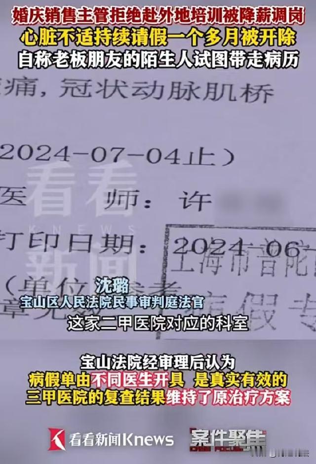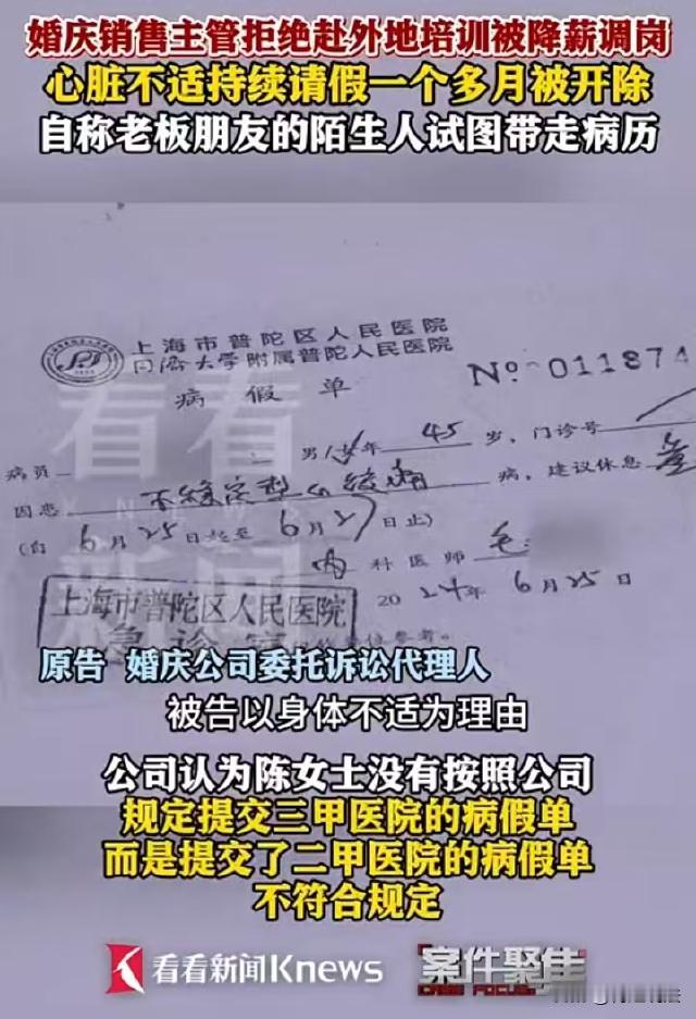 上海,陈女士在某婚庆公司上班,因拒绝公司安排去外地培训,竟被降薪调岗,之后因心脏不适,请了一个半月的病假,公司却以旷工为由把她开除了,还不支付病假工资。陈女士申请劳动仲裁后,公司不服,又诉至法院。 据报道,陈女士在这家婚庆公司当销售主管,业绩也相当不错。 去年6月,公司突然通知她要去大庆培训一个月。 陈女士仔细考虑后,觉得这培训时间太长,家里还有一堆事要处理,实在抽不开身,便拒绝了公司的安排。 这一拒绝,可惹了大麻烦。 公司直接给她降了薪,还把她从销售主管的岗位,调到了销售顾问。 陈女士想着多一事不如少一事,也就先忍了下来。 没多久,陈女士感觉心脏不舒服,去医院检查,查出了心肌桥。 医生建议她好好休息,陈女士便向公司请了一个半月的病假,她拿着二甲医院开的病假单,以为公司会理解。 可公司却不这么想,他们怀疑陈女士是在泡病假。 公司负责人表示,按照公司规定,病假单必须得是三甲医院开的才行,陈女士拿二甲医院的病假单,根本不算数,所以认定她旷工。 陈女士解释说,二甲医院的病假单是真实有效的,而且她也愿意配合去三甲医院复查。 可公司根本不听她的解释,直接就把她开除了,还一分病假工资都不给。 陈女士,彻底寒了心,她觉得公司这么做太过分了,完全不尊重员工的权益。 于是,她向劳动仲裁机构申请了劳动仲裁。 劳动仲裁裁定公司需支付工资差额及违法解除赔偿金5万余元,公司并不服气,一纸诉状起诉了陈女士。 公司坚称陈女士拒绝培训是违反公司规定,而且病假单不符合要求,开除她合情合理。 陈女士说自己拒绝培训是有合理理由的,家里确实有事走不开。 而且自己生病请假也是事实,二甲医院的病假单同样具有法律效力,公司无端怀疑还开除自己,属于违法解除劳动合同。 公司以陈女士提供非三甲医院病假单认定其旷工并开除,此做法是否合法呢? 对于公司因陈女士拒绝培训就降薪调岗的行为,《劳动合同法》规定,用人单位与劳动者协商一致,可以变更劳动合同约定的内容,变更劳动合同,应当采用书面形式。 公司未与陈女士协商一致,单方面降薪调岗,这违反了劳动合同法。 公司违法调岗降薪,劳动者可以要求公司按照原劳动合同履行,若给劳动者造成损失的,还应承担赔偿责任。 依据《企业职工患病或非因工负伤医疗期规定》,职工患病或非因工负伤,需停止工作医疗时,企业应给予医疗期。 陈女士也拿出了二甲医院的病历和病假单,还有她去三甲医院复查的报告。 陈女士说,二甲医院的病假单是对应科室多名医生开的,医院也确认了真实性和诊断依据。 而且她也按照公司的要求去三甲医院复查了,复查结果和二甲医院的一样,维持了原来的诊断方案。 公司却还是坚持自己的说法,说陈女士没及时交三甲医院的病假单,就是旷工。 公司的人事,根本没及时要求陈女士重新在三甲医院开病假单,事后以此认定病假单无效根本没依据。 审理时还指出,用人单位安排员工去复核病情,在医院的选择、检查项目还有次数上都得合理,不能过度增加员工的负担。 公司的做法明显缺乏依据,完全没考虑到员工的实际情况。 同时,劳动部关于贯彻《企业职工患病或非因工负伤医疗期规定》的通知中提到,职工提交的病假证明,只要是合法医疗机构出具的有效证明就应认可。 在本案里,陈女士拿着二甲医院开的病假单请假,这二甲医院属于合法医疗机构,其出具的病假单具有法律效力。 公司规定病假单必须三甲医院开具,这规定本身就超出了合理范畴,缺乏法律依据。 《劳动法》规定,企业职工因患病或非因工负伤,需要停止工作医疗时,根据本人实际参加工作年限和在本单位工作年限,给予三个月到二十四个月的医疗期。 并没有规定病假单必须为三甲医院开具,只要病假单真实有效即可。 依据《劳动合同法》,用人单位违法解除或者终止劳动合同的,应当依照经济补偿标准的二倍向劳动者支付赔偿金。 陈女士在这家公司工作,如果工作年限等情况符合规定,公司需支付相应赔偿金。 公司仅因陈女士提供二甲医院病假单,就认定她旷工,进而开除她,这种做法明显违反了上述规定。 陈女士生病请假是事实,且提供了有效病假证明,公司无权以不合理规定否定其病假事实并开除。 公司这种行为,侵犯了陈女士的合法权益,属于违法解除劳动合同。 按照劳动合同法规定,用人单位违法解除劳动合同,应当向劳动者支付赔偿金。 所以,公司以非三甲医院病假单认定旷工并开除陈女士的做法不合法。 公司太过分,员工有合理理由拒绝培训,生病请假也是人之常情,公司怎么能无端怀疑员工,还随便开除人,这完全就是不尊重员工的权益。 法院经过仔细审理,认为陈女士拒绝培训虽有自身原因,但并不构成严重违反公司规章制度。而公司以非三甲医院病假单为由认定旷工并开除员工,缺乏合理依据。 最终,法院判决公司应给予陈女士病假待遇,支付违法解除劳动合同赔偿金。