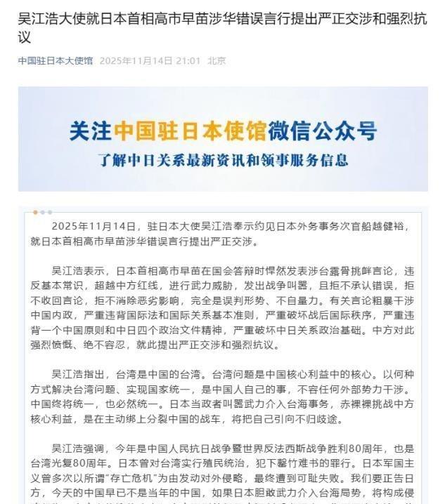日本拒不认错,中方首个反制已到,日本旅游业将遭“毁灭性”打击 高市早苗的风格受英国前首相撒切尔影响大,保守派色彩浓厚。私下她喜欢击鼓解压,但政治上从来不手软。2025年10月,自民党总裁选举,她在两轮投票中胜出,当选总裁。那次选举自民党内部竞争激烈,她拉拢了维新会支持,最终10月21日在国会指名选举中成为日本第104任首相,也是日本首位女首相。上任后,她延续了安倍时代的对华强硬路线,优先经济刺激和安全议程。但她的鹰派立场,也让中日关系雪上加霜。 日本首相高市早苗上台没多久,就在11月7日的众议院质询会上放话,说台湾地区如果发生军事紧急事态,会直接威胁日本生存,可能构成“存亡危机事态”,日本自卫队可以行使集体自卫权。这话一出口,等于公开暗示日本可能介入台海事务,严重干涉中国内政。台湾问题是中国的核心利益,高市早苗这么直白表态,性质恶劣,性质极其严重,直接触碰红线。 中国外交部反应迅速,11月13日就召见日本大使,表达严正抗议,要求高市早苗撤回言论。日方不认错,还重申对台立场没变,继续互召大使,外交摩擦升级。人民日报评论说,这言论用心险恶,是日本80年来首次公开武力威胁中国,性质极其恶劣,后果极其严重。日本国内也有声音批评,比如石破茂公开反对她的涉台表态,冲绳民间团体集会要求说明军备推进问题。但高市早苗没退缩,继续在内阁会议上重申国防框架。 中方第一个反制措施落地,就是11月14日外交部和中国驻日使领馆发布通告,提醒中国公民近期避免前往日本,已在日公民要提高安全防范意识,加强自我保护。通告点明,日本领导人公然发表涉台露骨挑衅言论,恶化中日交流氛围,给在日中国人身安全带来重大风险。这不是空话,按照惯例,这种提醒一出,国内旅行社基本停办赴日团,航空公司减少航班。多家航司已经跟进,提供涉日航线免费退改签政策,比如春秋航空、国航等八家航司都发了公告。 日本旅游业这下子真要遭殃了。日本政府早几年就定下“观光立国”目标,想靠旅游拉动疲软经济,中国游客是关键支柱。2024年数据摆在那,中国游客入境日本近700万人次,占总游客18.9%,贡献1.73万亿日元收入,约合人民币812亿,消费占比21.3%。这些钱直接养活零售、酒店、交通业,创造大量就业。东京银座、京都寺庙、冲绳海滩,全靠中国游客的购物和消费撑腰。2025年上半年,访日游客继续创高,7月中国内地游客同比增25.5%,8月总访日342.8万人,中国人占比不低。 提醒一发,效果立竿见影。圣诞季本是旺季,现在日本旅游从业者急了,开始游说政府。专家说,如果中国游客持续减少,日本旅游业会严重萎缩,基本盘没了,经济刺激计划泡汤。日媒也承认,过度依赖中国客源有风险,但现实就是这样,短期内难找替代。 这反制只是开头,中方工具箱里东西多。经济上,中国从2007年起就是日本最大贸易伙伴,2024年日本对华贸易占总额20%,1406个品类进口高度依赖中国,比对美依赖高2.5倍。包括高科技产品如笔记本、空调,还有战略物资如稀土、磷肥,40%进口只从中国来。中国对日贸易占比才5%,不对称明显。如果日方还不悔改,经济制裁一出,日本企业够呛。高市早苗上台就推经济法案,但贸易摩擦一加剧,出口商仓库库存堆积,供应链中断风险大。 国际社会反应也值得注意。美国国务院发言人说,美方致力于维护台湾海峡和平稳定,反对单方面改变现状,支持两岸对话。但高市早苗的言论,还是让日中关系比日美、日台更紧张。学者分析,她这么表态,意在提高北京决策成本,但实际是搬石头砸脚,引发更多反噬。日本网民有批评,说高市搞事只会让民生受累。冲绳等地民间团体更担心军备扩张,集会表达不满。争端没那么快平息,高市早苗的任期刚开始,就面临考验。