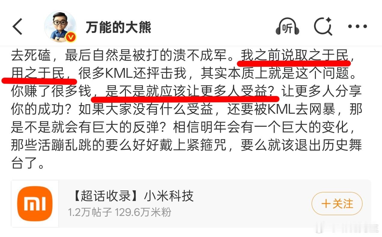 万能的大熊这位老师,卖保健品比较擅长,治绝经的能力也不遑多让,就是动不动喜欢玩微商那套,装高雅和上流人士。这哥们脑子肯定够用,就是没什么文化,他总以为写几本厕所刊物就能"格局逆袭"了。"取之于民用之于民"这种话语,显然是表述国家的,一个企业赚的钱是卖产品得来的,又不是收税,哪来的"取之于民"?要充值就直说,熊老师作为"闻化人",何必如此虚伪?要"用之于民",熊老师干倒闭五家公司的赚的钱,用之于民了吗?