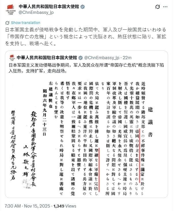 危险信号!日媒曲解国防部发言,网民叫嚣“出兵中国”,难怪石破茂下台前执意做这两件事 说起石破茂下台前那两件事,得从日本政坛的暗流说起。2025年9月底,他知道党内右翼要换人,高市早苗那种鹰派上位在即,他就抓紧时间干了两件跟历史反思相关的事儿。第一件,推动国会恢复1940年斋藤隆夫的“反军演说”记录。那是二战前,日本正侵华,斋藤在众议院讲了1.5小时,猛批军部扩张,说继续打下去国家就完了,结果被除名,记录删了三分之二。石破茂让团队联系国会图书馆,10月1日正式协调补回全文,目的是提醒大家,别让民粹和军国老路重演。 第二件,10月10日发表“战后80年谈话”,直戳日本战前体制毛病。他说大日本帝国宪法有结构性缺陷,文官统制弱,军部寡头腐朽,扩张狂热酿大祸。谈话聚焦决策系统崩溃,为什么战争避不开,得从根上审视。高市早苗一看就反对,说这会弱化国家意志,党内会议上她直摇头。石破茂还是发了,但没啥水花。事后看,这两件事像他留的政治遗产,警醒后人别轻率卷入战争。可惜,高市上台后,这些东西基本被晾一边。 现在回头看,这两件事跟当下中日摩擦脱不了干系。2025年11月7日,高市早苗在众议院预算委员会答辩,说台湾地区有事,可能成日本“存亡危机事态”,自卫队能行使集体自卫权介入。这话一出,北京炸锅。11月13日,外交部副部长孙卫东召见日本大使金杉宪治,严正交涉,说高市违反一个中国原则,干涉内政,敦促撤回言论。次日,国防部发言人蒋斌回应,强调日方若一意孤行,会付出沉重代价,话里带“头破血流”这种表述。 日本媒体立马跟上,产经新闻、时事通讯社这些右倾刊物,把中国回应曲解成“砍头威胁”,硬说针对高市本人。薛剑总领事在X上发帖,本来是回击日方涉台言论,结果被他们剪辑成“脏首级一瞬砍掉”。这翻译加工,明显火上浇油,煽动民意。网上反应更猛,日本网民在推特、论坛刷屏,有人直呼“让中国再尝甲午海战”,右翼团体喊“出兵教训”,政客虽含糊,但暗示需给中国颜色。整个氛围,像二战前那股狂热味儿,又冒头了。 这事儿搁谁身上都觉得危险。日本右翼借机推军费、扩自卫队,忽略历史教训。高市上台后,自民党“双少数”局面更乱,她靠保守派票上位,但经济压力大,通胀高企,民众本盼稳日子,结果她先闹外交。石破茂下台前那两件事,本意是拉闸警示,可高市阵营直接否决。结果呢,中日互召大使,交流氛围恶化,中国使馆提醒公民避日。 事态还在发酵。11月14日,日本外相茂木敏充回击,说高市发言是自卫权,没撤回必要,坚持1972年日中联合声明,但对台立场不变。中国大使吴江浩抗议高市露骨挑衅,拒不认错。高市这路子,性质恶劣,用心险恶。她不顾后果,突破和平宪法,右翼偏执想当军事大国。石破努力白费,日本重蹈军国覆辙迹象浓。