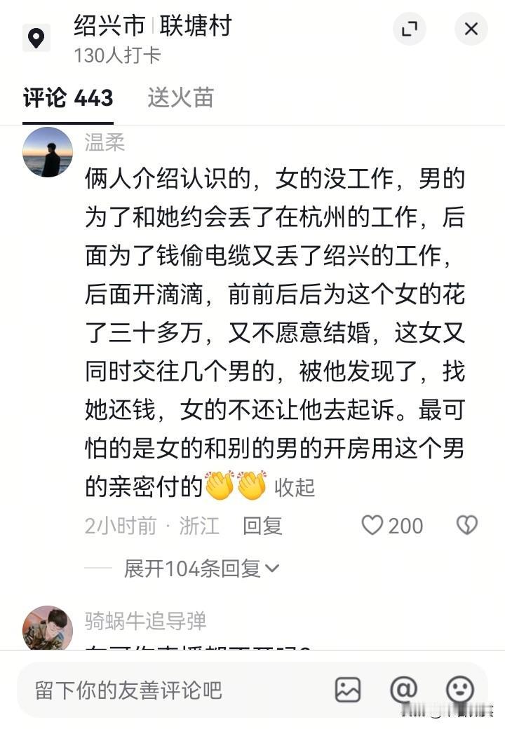 这哥们太惨了[我想静静],为了和女朋友在一块把杭州的工作辞了,来到绍兴因为偷电缆又丢了在绍兴的工作,最后找了一份开滴滴的工作,前前后后给女朋友花了30多万,结果,女朋友不愿意和他结婚,还同时交往几个男的[打脸]。 这30多万,如果有大额的转账还有可能要回来,如果是买了金银首饰、品牌包包和日常吃吃喝喝的消费,很有可能要不回来,即使能要回来,估计也没多少钱,最多也就几万块钱。 谈恋爱要量力而行,遇到比较物质的女孩,有实力就跟她谈,没能力硬着头皮谈,只会一败涂地,最后人财两空!