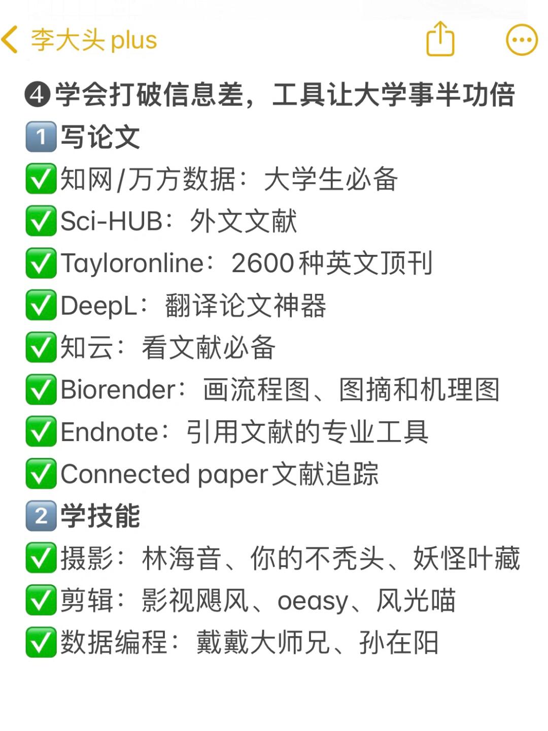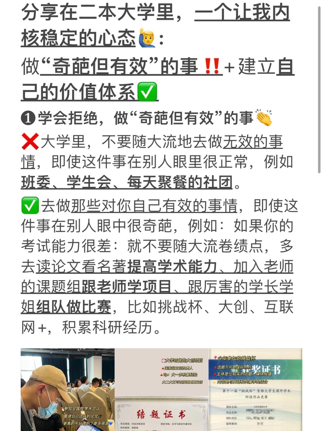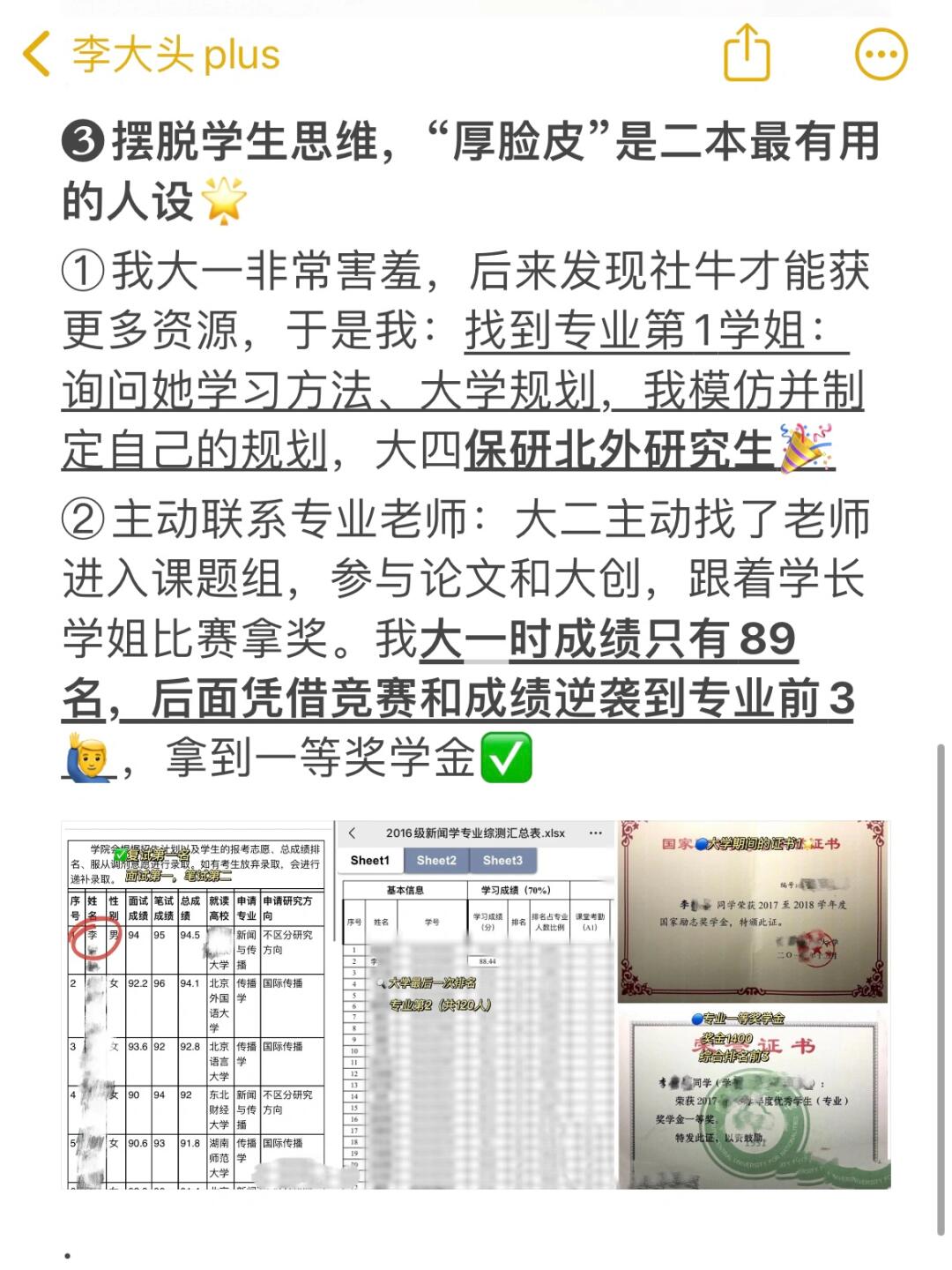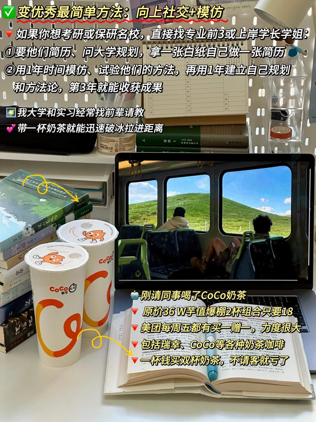 Hi,我是大头学长,二本上岸北外研究生的普通男生 . 上了4年二本,我发现大学里有一个超有用的心态:社交保持糊涂+学习保持清醒。很多人考上二本后,过于依赖辅导员和学姐经验,却没有掌握自我学习的方法。我用6年时间,试探出一条有用的方法: . ❶要有“你很棒,但关我屁事”的觉悟 ①我大一时绩点3.5,问专业第1的学姐:我有机会保研吗?她果断告诉我:不可能。这句话让我跌入谷底,却燃起我的斗志: ②笔试能力差:我就把每次平时作业做好,选课多选实践占比高的,大二将绩点拉到专业前3 ③绩点有差距:我就做比赛加分,拼命参加大广赛、大英赛、挑战杯,去广西调研、熬夜通宵。大三我拿到两个大奖,拿到保研资格去了北外 · ❷学习学霸,但是不迷信学霸 如果你想考研或保研名校,直接找专业前3或上岸学长学姐: ①要他们简历、问大学规划,拿一张白纸自己做一张简历 ②用1年时间模仿、试验他们的方法,再用1年建立自己规划和方法论,第3年就能收获成果 · ❸摆脱学生思维,抄是成功最简单方法 我学姐专业第1、四六级600+,2天复习1本专业课考到90+,她告诉我这个方法 ①整理框架:先通读全本书+画出框架,将每章节内容提炼成关键词填充 ②默写框架:盖住思维导图,画框架+背诵 ③订正背诵:对照书本,没默出的反复背诵 . ❹利用大学时间,疯狂自我提升 ①自学技能,副业独立 ️摄影:林海音、敬伟 ️剪辑:风光喵、南门录像厅 办公:拉小登、旁门左道 论文:万方数据、镝数据、艾媒数据 . ②苦练英语,复合其他学科 ①音标:田朝霞语音+赖世雄 ②听力:烤鸭tv、瑞秋英语 ③阅读:张满胜、语法俱乐部、瑞思拜、田静 . ③向上社交,争取资源 实习和比赛,模仿大佬是小白成功捷径。比如在社团,每周五都买奶茶缠学长教剪辑;实习时我找前辈请教,一杯奶茶就能轻易破冰(我社交窍门)现在每周五有美团外卖奶茶狂欢日活动,今天刚请朋友喝CoCo奶茶,原价36元只花了18,活动力度很大不冲白不冲,太适合周五约朋友和请客社交啦!从1月5日起,上美团外卖APP🔍“买一赠一”,蹲10-19点整点抢36-18元红包,爆款奶茶双杯5折就能到手,咱们要利用这个好节点省钱社交,不请客就亏了。
