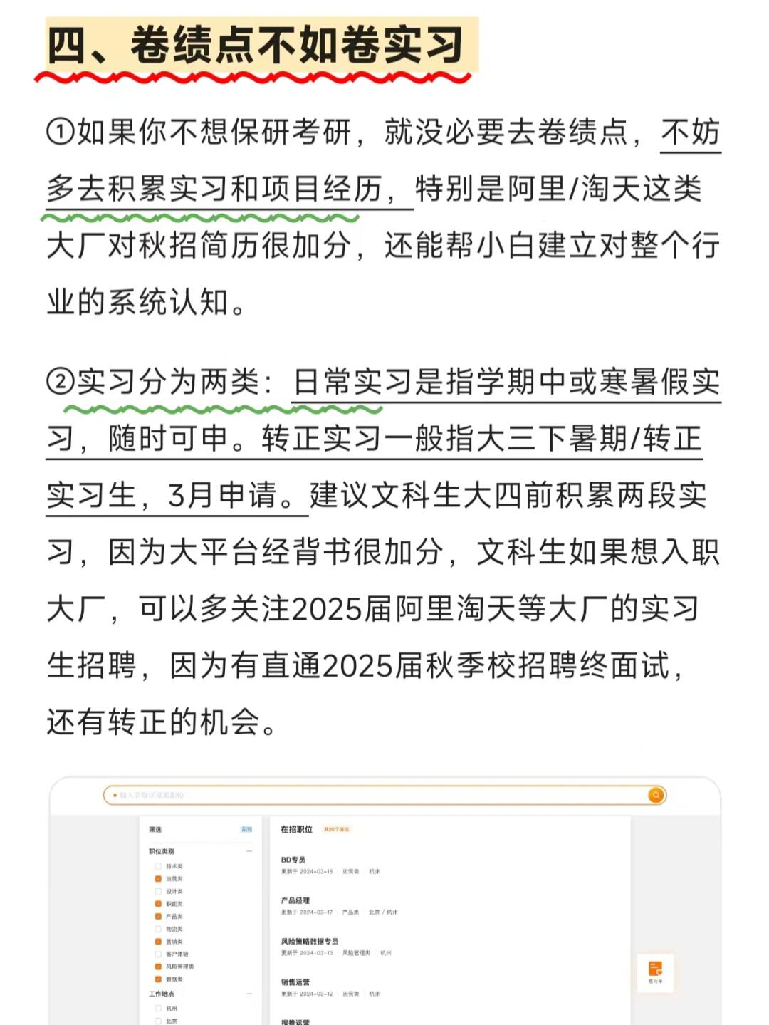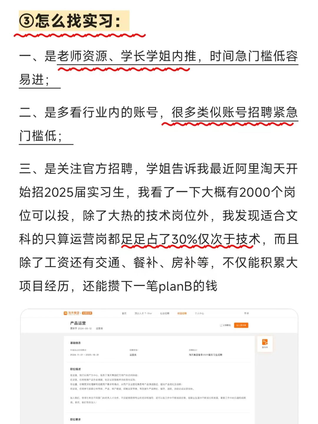 上一期说到:自己作为学了6年文科的老学长,本硕期间做过5段实习,涵盖互联、国企、媒体等,我深感无论普通本科还是985/211文科就业的难度。 . 有句话我很赞同“文科生找工作和面试,其实就是在筛选信息闭塞的人。这几年我发现身边厉害的文科生都在另辟蹊径,真心建议大家去离钱近的岗位 . ❶挑选风口行业 ①长青赛道:大健康、教育辅导、健身营养、美妆 ②热门赛道:芯片/半导体/低碳行业/新能源赛道/互联网产品/自媒体博主 ③未来赛道:人工智能/大数据和云计算/银发经济/宠物+大健康行业 . ❷离钱远且很累的行业 ①性价比低:收纳/财务/护士/幼师/文员 ②走下坡路行业:煤炭钢铁化工/房地产/教培/非大厂游戏行业 . ❸有“钱途”的岗位 ①互联网产品运营:自学数据分析类技能,文科待遇较好 ②战略/策略管培生: 积累行业研究类或咨询类实习 ③科技类行业海外运营:做海外用户增长营销,适合英语好或小语种 ④行业类国企宣传岗:建筑、汽车、能源等企业宣传岗,需要新媒体经验+排版文案 ⑤外企品牌类岗: 适合传媒/社科类专业,英语能力强有实习经历 ⑥双语人才:汉语言或者对外汉语相关专业吗,把英语学好可以入职国企外派 ⑧自媒体副业:有一技之长适合做自媒体,一个月赚个几千让生活更有底气 . ❹多关注大厂实习 ①如果你不想保研,就没必要卷绩点,不妨多去积累实习和项目经历,特别是阿里/淘天这类大厂对秋招简历很加分,还能帮小白建立对整个行业认知 . ②怎么找实习:一是老师资源、学长学姐内推,时间急门槛低容易进;二是多看行业账号;三是关注官方招聘,学姐说最近阿里淘天开始招2025届实习生,预计有2000多个offer,适合文科的岗位只算运营岗都占比30%仅次于技术,还有直通2025届秋季校招聘终面试和转正机会,很适合文科生逆风翻盘,而且除了工资还有交通、餐补、房补等,不仅能积累大项目经历,还能攒下一笔planB的钱。 ③半年进阶:python入门基础,掌握chatgp就好
