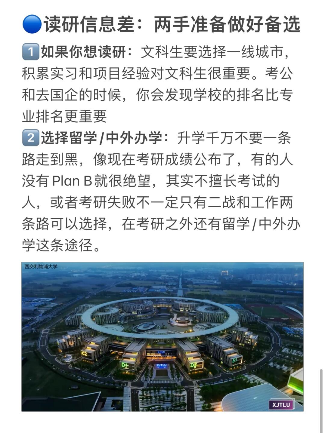 1️⃣选择升学时不要一条路走到黑,像现在考研成绩公布,有人没有Plan B很绝望,其实不擅长考试或考研失败不一定只有二战和工作可选,考研之外还有留学/中外办学这条路