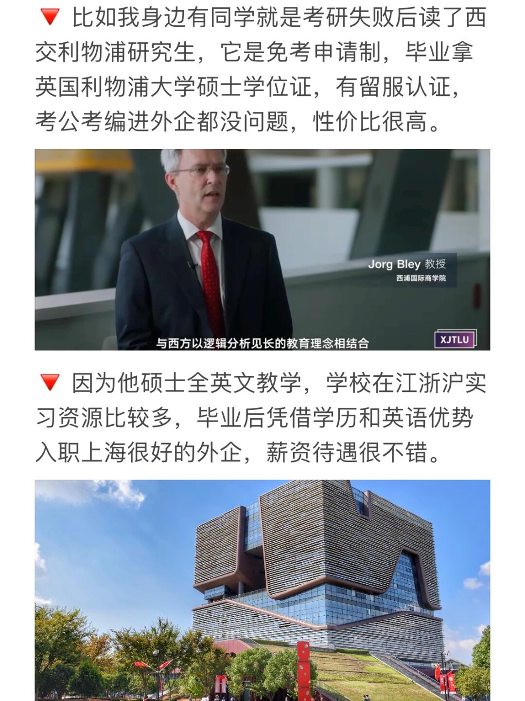 2️⃣比如我同学考研失败后读了西交利物浦研究生,它是免考申请制,毕业拿的英国利物浦大学硕士学位证,有留服认证,考公考编进外企都没问题,性价比很高。因为硕士全英文教学,提高英语水平,而且学校在江浙沪实习资源多,所以毕业靠学历和英语优势入职上海的好外企,薪资待遇不错