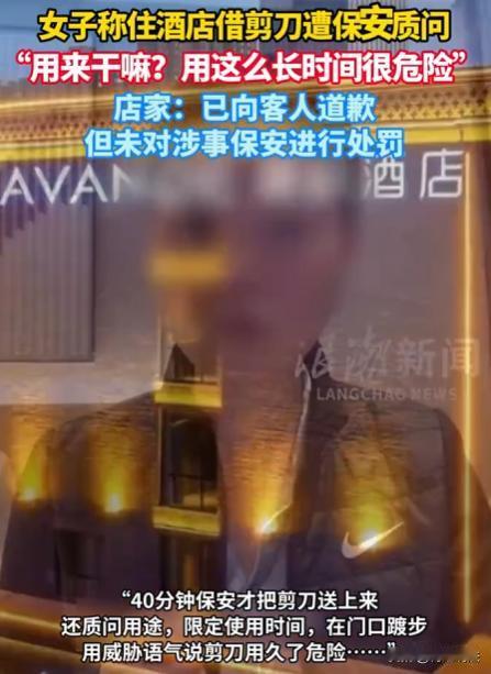 甘肃兰州,一女子独自入住一家酒店,打算住4天,处理工作上的事,晚10点多,她因外套袖口有线头,向酒店前台借剪刀,40分钟后安保送来,不仅询问用途和使用时长,还在她明确告知用完会联系归还后,仍在门口踱步、往房间张望。女子感到被侵犯,向酒店投诉遭到拒绝,一气之下将此事发到网上,引发了网友热议。 女子去兰州出差,11月11日提前订了家酒店,打算住4天处理工作的事,可谁能想到,后面发生的事,让她烦透了。 12日晚10点多,她回酒店,发现外套袖口有线头,想着借把剪刀处理下,她到前台说明情况,前台说让安保送来。 她就在房间等着,心里还想着这剪刀很快就能到,处理完线头接着工作。可这一等就是40分钟,安保才把剪刀送来。 安保一进来,开口就问借剪刀干啥、用多久。女子就耐心说明,自己就是处理下外套线头,用完就还。 可这安保,就在门口来回走,还时不时往里望。 女子本来就一个人住,大晚上的,这安保的行为让她又慌又气,她觉得自己的隐私被侵犯了,心里特别不舒服,工作也没心思了。 女子向酒店投诉,想着酒店能给她个说法,可酒店居然拒绝了她的投诉。 女子这下彻底火了,一气之下把这事发到了网上,这消息一传开,网友的各种评论都有。 有人说安保是为女子安全考虑,提醒、守候是好心,毕竟现在安全问题是大事,万一女子用剪刀出点什么事,酒店也担责任。 可也有人说,安保这么做太过分了,女子都明确告知归还方式了,还逗留张望,这明显是侵犯隐私。 大家争议的焦点就在于,安保的行为到底算不算侵犯隐私,酒店该不该担责任,女子觉得自己的私人生活安宁被侵扰了,酒店没保障好她的安全,还纵容安保这样。 酒店觉得安保是为安全着想,做法虽然欠妥,但不算侵犯隐私。 民法典规定,宾馆房间属于私密空间,任何组织或者个人不得以刺探、侵扰、泄露、公开等方式侵害他人的隐私权。 在这件事里,安保在女子明确告知归还方式后,还在门口逗留张望。这行为已经超出了正常工作范畴,对女子的私人生活安宁造成了侵扰。 虽然安保主观上可能是为了确保安全,但这并不能成为他侵犯隐私的借口。 酒店对住客有安全保障义务,这包括保障住客的人身安全和隐私安全。女子用剪刀,如果真出了意外,酒店肯定得担责。 安保在门口守候,虽然目的是保障安全,但考虑不周全,影响了女子的心理安全,酒店没有约束好安保的行为,存在管理疏漏,所以酒店也应该承担侵权责任。 安保主观上是为安全考虑,这算不算侵犯隐私呢? 民法典里规定,侵害隐私权的行为,不管主观上是故意还是过失,只要造成了侵害结果,就要承担责任。 安保虽然主观上是为安全,但他的行为客观上已经侵扰了女子的隐私,所以还是构成侵犯隐私权。 酒店没约束好安保,要承担什么责任呢? 根据民法典,宾馆等经营场所的经营者,未尽到安全保障义务,造成他人损害的,应当承担侵权责任。 酒店没约束好安保,导致女子隐私被侵犯,所以酒店要承担相应的赔偿责任。 14日,酒店和安保向女子道了歉,女子退了房,安保没受处罚继续上班。 女子还是觉得安保应该受到处罚,酒店应该更重视住客的隐私安全。