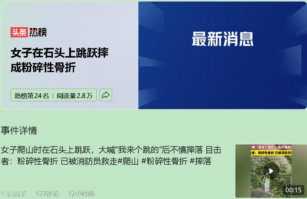 大山从不承诺温柔——那句欢快的“我来个跳的!”刚出口,人就跟着松动的石头一起摔了下去。咔嚓一声,粉碎性骨折,剧痛瞬间击碎了所有户外浪漫幻想。 真别觉得这种事离我们很远! 你肯定也见过那些“炫技”视频,飞身一跃,又飒又稳。可现实是,山里到处都是“隐形杀手”:长满苔藓的石头、看似牢固其实早已风化的岩块、看不清的沙粒和暗冰……你以为的“轻轻一跳”,很可能就是“一跳毁所有”。 更可怕的是“迷之自信”。累了还硬撑,觉得自己“状态还行”,结果肾上腺素一上来,判断力直接掉线。疲劳真的会偷走你的协调能力,再厉害的户外老手也可能栽跟头。 记住这几条保命思路: 观察比动作重要,先看再动 移动时尽量保持“三点接触” 想跳之前,先把背包卸了——负重会带偏重心 该放弃时就放弃,不丢人 别被“网红打卡”带偏节奏。真正的户外不是征服自然,而是学会和她平等对话。有些高度,没有专业训练真的别随便挑战。 生命没有重来键,大山也不会为我们网开一面。走出去是为了感受美好,而不是为了那一瞬间的“炫”,赌上所有可能。