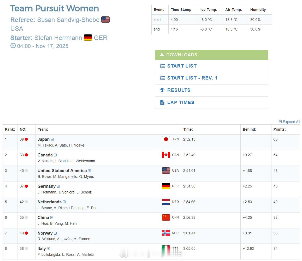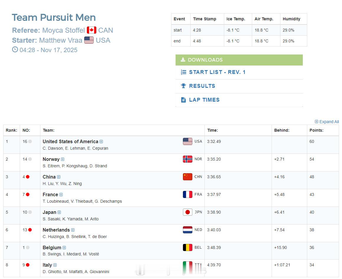 【速滑世界杯中国男子团体追逐摘铜美荷世界纪录】11月16日,速滑世界杯美国盐