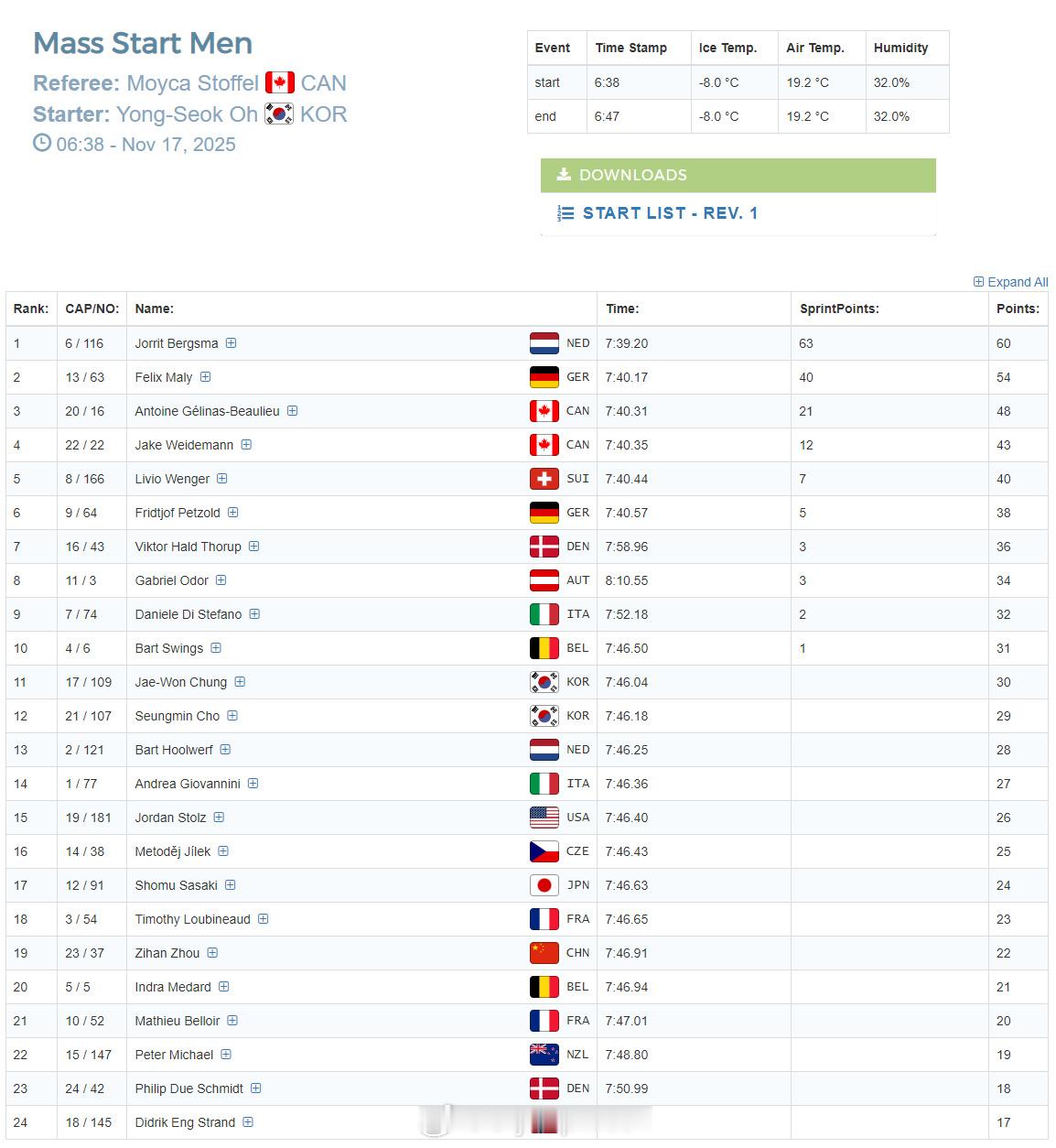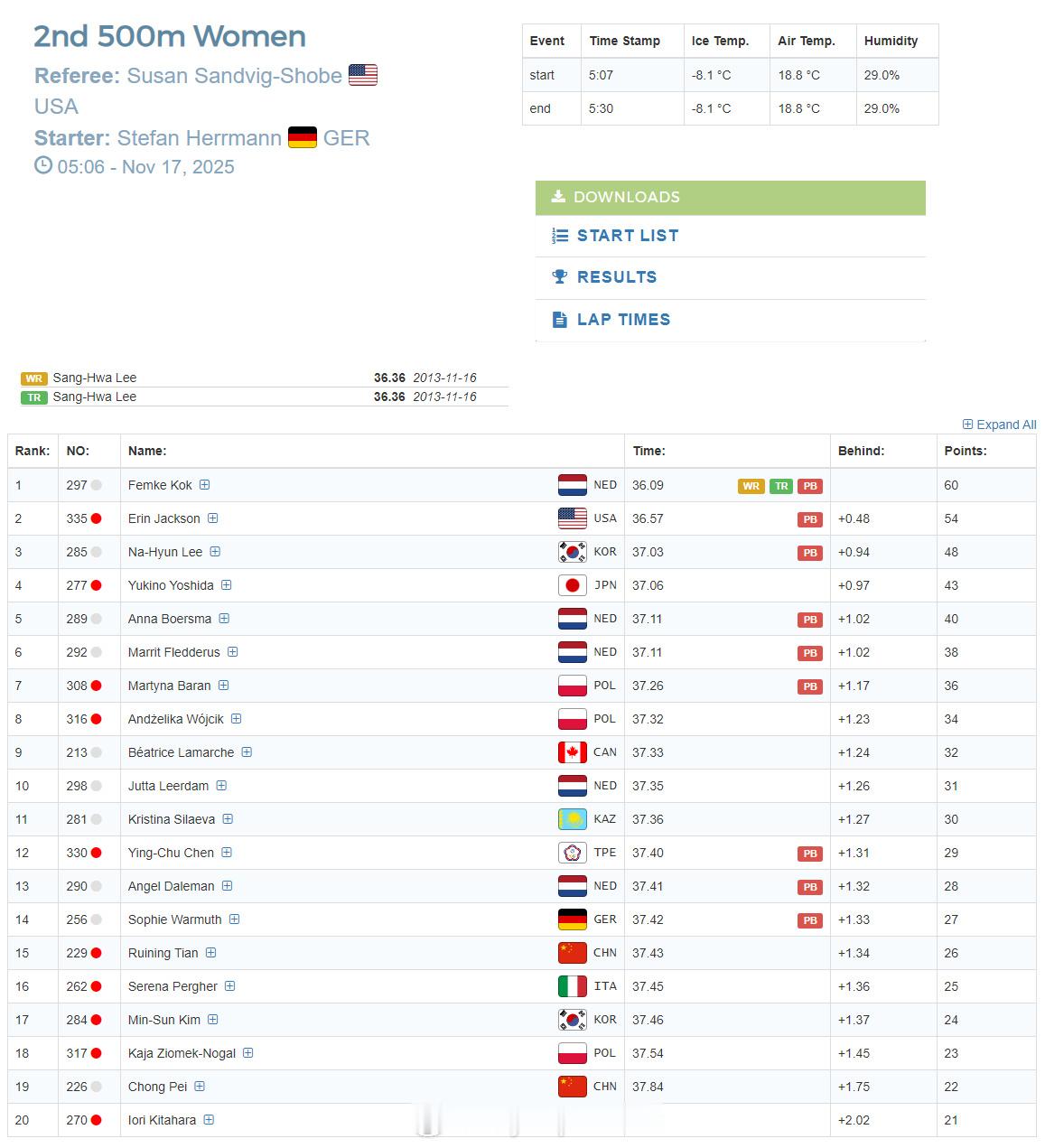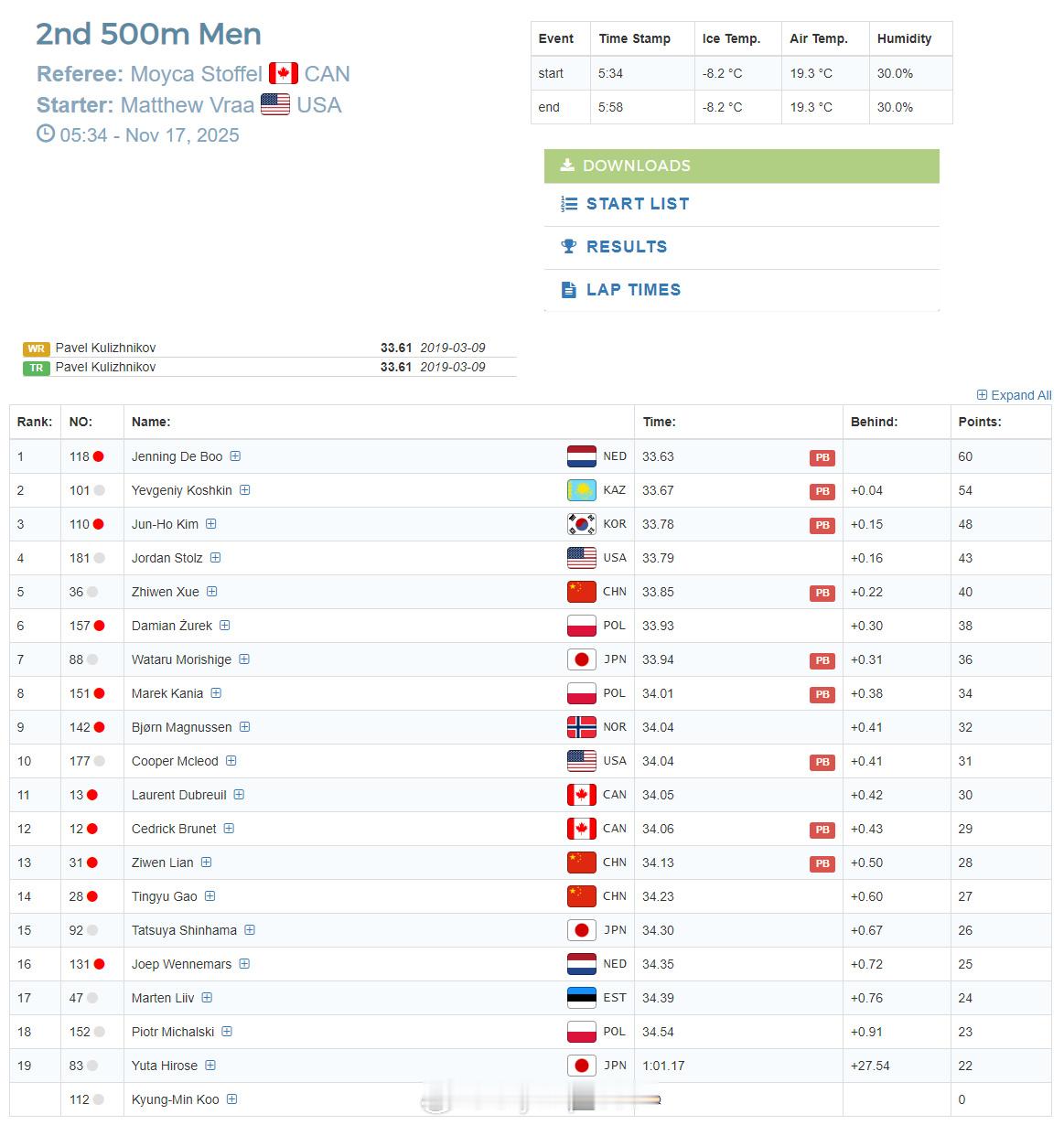 【速滑世界杯中国男子团体追逐摘铜 美荷世界纪录】 11月16日,速滑世界杯美国盐湖城站比赛最后一个比赛日结束。由宁忠岩、吴宇和刘瀚彬组成的中国队在男子团体追逐赛中夺得铜牌,美国和挪威分获冠亚军,美国队还以3分32秒49打破他们去年1月创造的3分33秒66的世界纪录。在男子500米(第二次)中,荷兰德波以33秒63夺冠,中国选手薛志文落后0.22秒名列第五,已经拿到本站三枚金牌的美国名将斯托尔茨排名第四,另外两位中国选手廉子文和高亭宇分列第12和13位;在女子500米(第二次)中,荷兰科克以36秒09将韩国李相花的世界纪录缩短了0.27秒并夺得冠军!中国队田芮宁和裴冲分列第15和19位;在其他几项比赛中,女子团体追逐中国第六,男子集体出发周梓涵第19,女子集体出发侯俊丹和杨滨瑜分列第8和第13位。