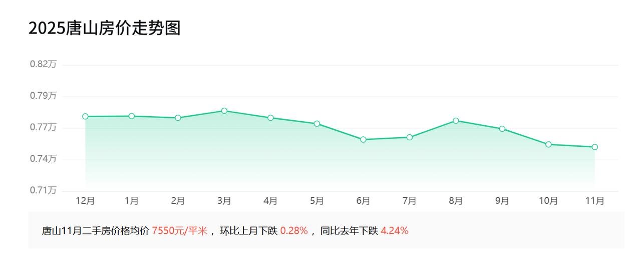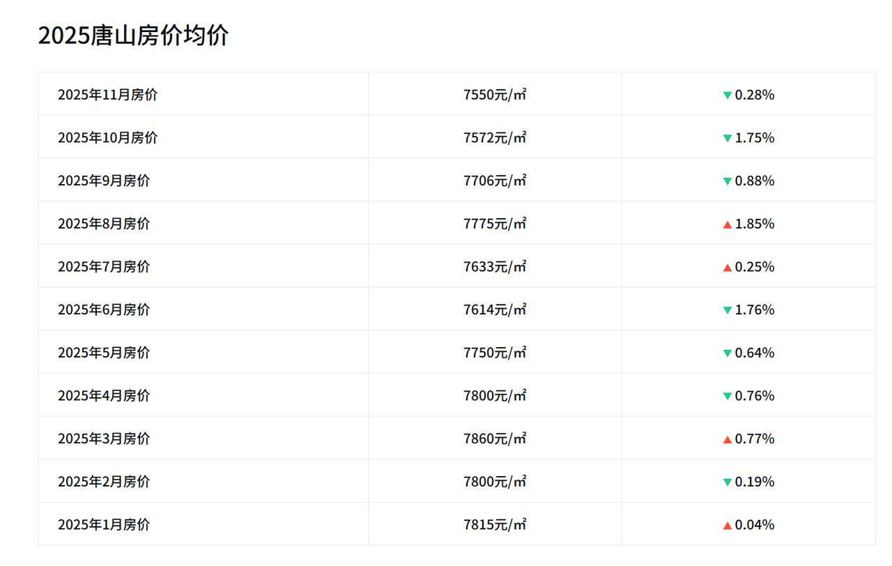 2015年10月,唐山房价均价6166元; 2016年10月,唐山房价均价6227元; 2017年10月,唐山房价均价7596元; 2018年10月,唐山房价均价8192元; 2019年10月,唐山房价均价9616元; 2020年10月,唐山房价均价10760元; 2021年10月,唐山房价均价9715元; 2022年10月,唐山房价均价9980元; 2023年10月,唐山房价均价8937元; 2024年10月,唐山房价均价7987元; 2025年10月,唐山房价均价7572元。   唐山近十年的房价走势,形成了一个倒U型曲线,这个曲线和全国房价走势基本吻合,主要分为三个阶段: 2015年至2020年,房价从6166元涨到10760元,涨幅达74.5%,主要原因是受棚改货币化政策,大量资金涌入楼市;2021年至2023年,房价回调至2018年水平;2024年至2025年,买方市场彻底成型。   2025年10月,路北、路南区房价比峰值跌33%,但价格仍比古冶区、曹妃甸区坚挺。   唐山楼市这十年,从狂热到理性,但对于真正需要房子的人,核心区、现房、低杠杆才是选择房子的真理。