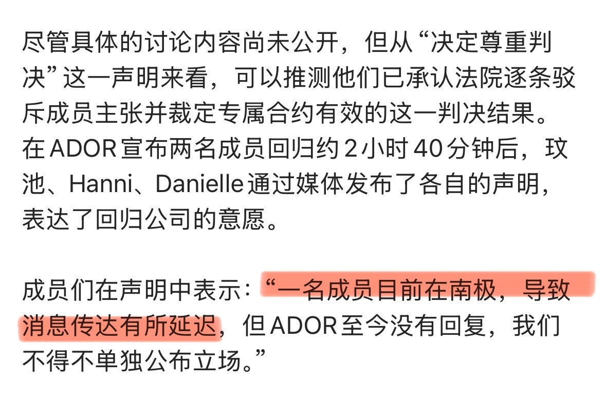 据韩媒:NewJeans里“身处南极的成员”是HANNI,因海外滞留缺席ador代表面谈