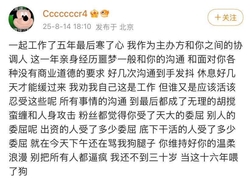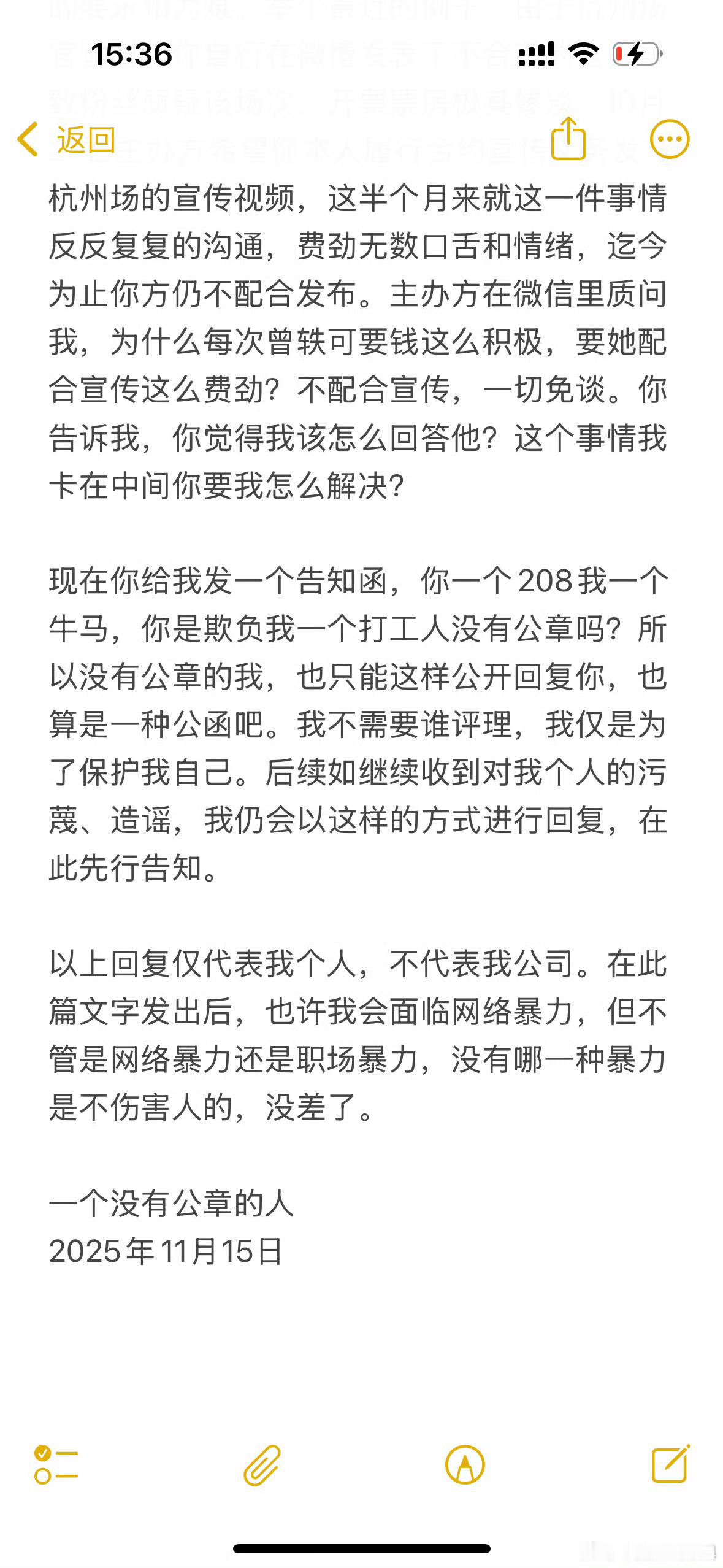 曾轶可的一位前工作人员多次发文控诉,文中提到:1️⃣该工作人员在2021-2025期间多次遭遇曾轶可的情绪失控行为,包括在录制节目途中被威胁罢演、因拒绝私联粉丝被骂、在东京巡演后台因婉拒额外工作被指责自私并遭遇罢演威胁,以及在咖啡厅开会时因对方拍桌子导致刀叉飞向自己脸部等。2️⃣11月15日,工作人员公开信提到,曾轶可因在微博发表不当言论导致杭州场演唱会票房惨淡后,始终未按合约配合拍摄宣传视频,致使主办方质疑合作诚意,使作为中间人的发文者陷入两难。3️⃣工作人员早在8月份就发博称五年合作最终寒了心,亲身经历如同噩梦一般。目前曾轶可方尚未对此事作出公开回应。