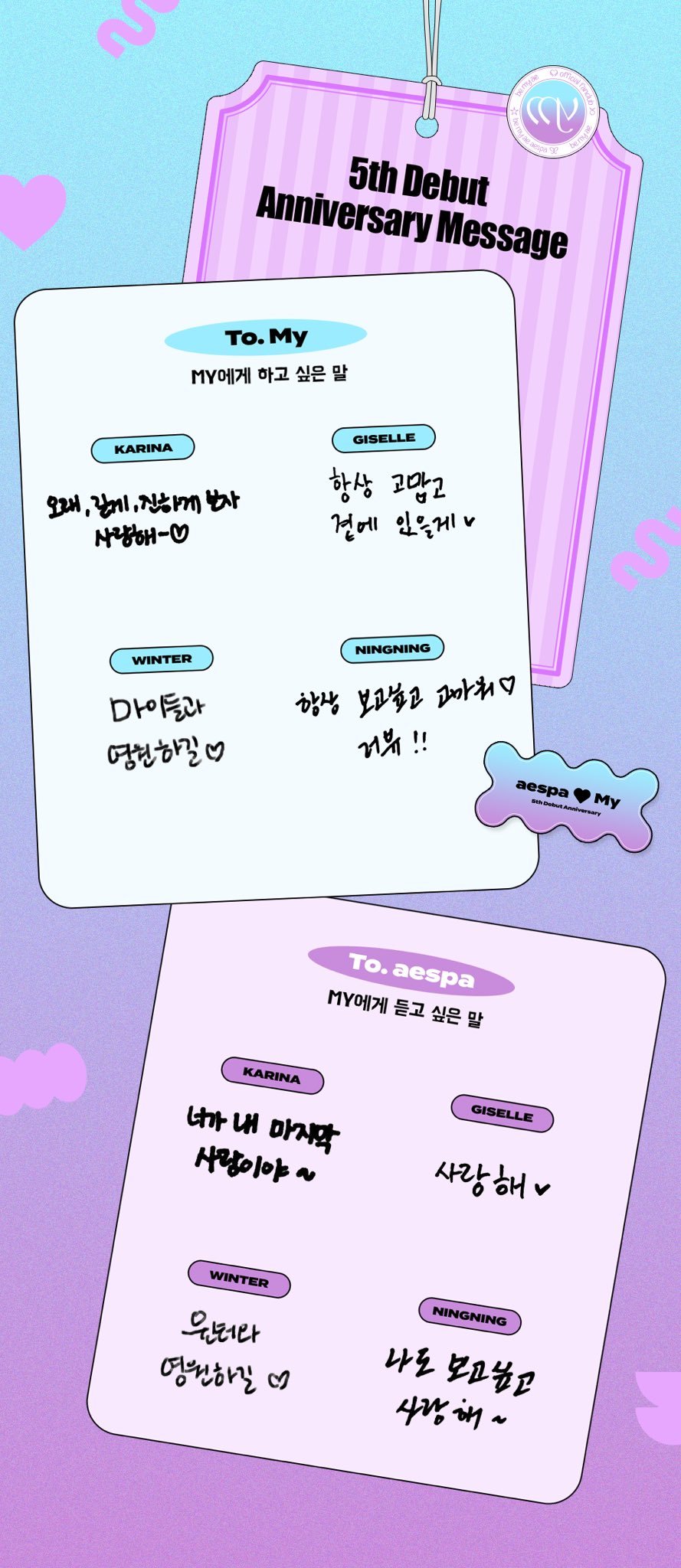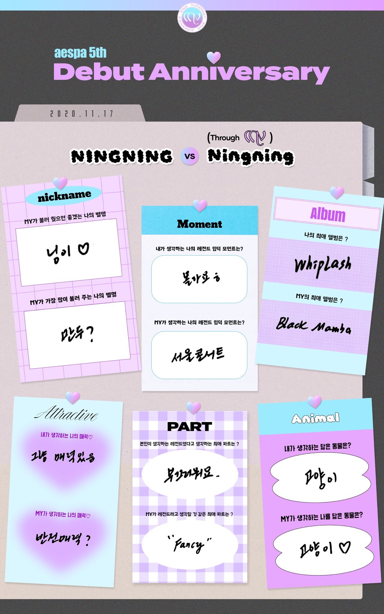 aespa debut 5th Anniversary Message 💌希望MY能叫我的昵称🦋:宁尼♡MY叫得最多的我的昵称🦋:饺子?我认为我的传奇入坑瞬间是?🦋:不知道啦ㅎMY认为我的传奇入坑瞬间是?🦋:首尔演唱会我最爱的专辑是?🦋:WhiplashMY最爱的专辑是?🦋:Black Mamba我认为自己的魅力♡🦋:就是有魅力MY认为我的魅力♡🦋:反转魅力?本人认为最经典的part是?🦋:我害羞/不好意思觉得MY认为最经典的最爱Part是?🦋:“Fancy”我认为长得像的动物是?🦋:小猫咪MY认为我长得像的动物是?🦋:小猫咪♡To MY 想对MY说的话🦋:总是很想你 谢谢♡ love uTo aespa 想听MY说的话🦋:我也想你 爱你哟~