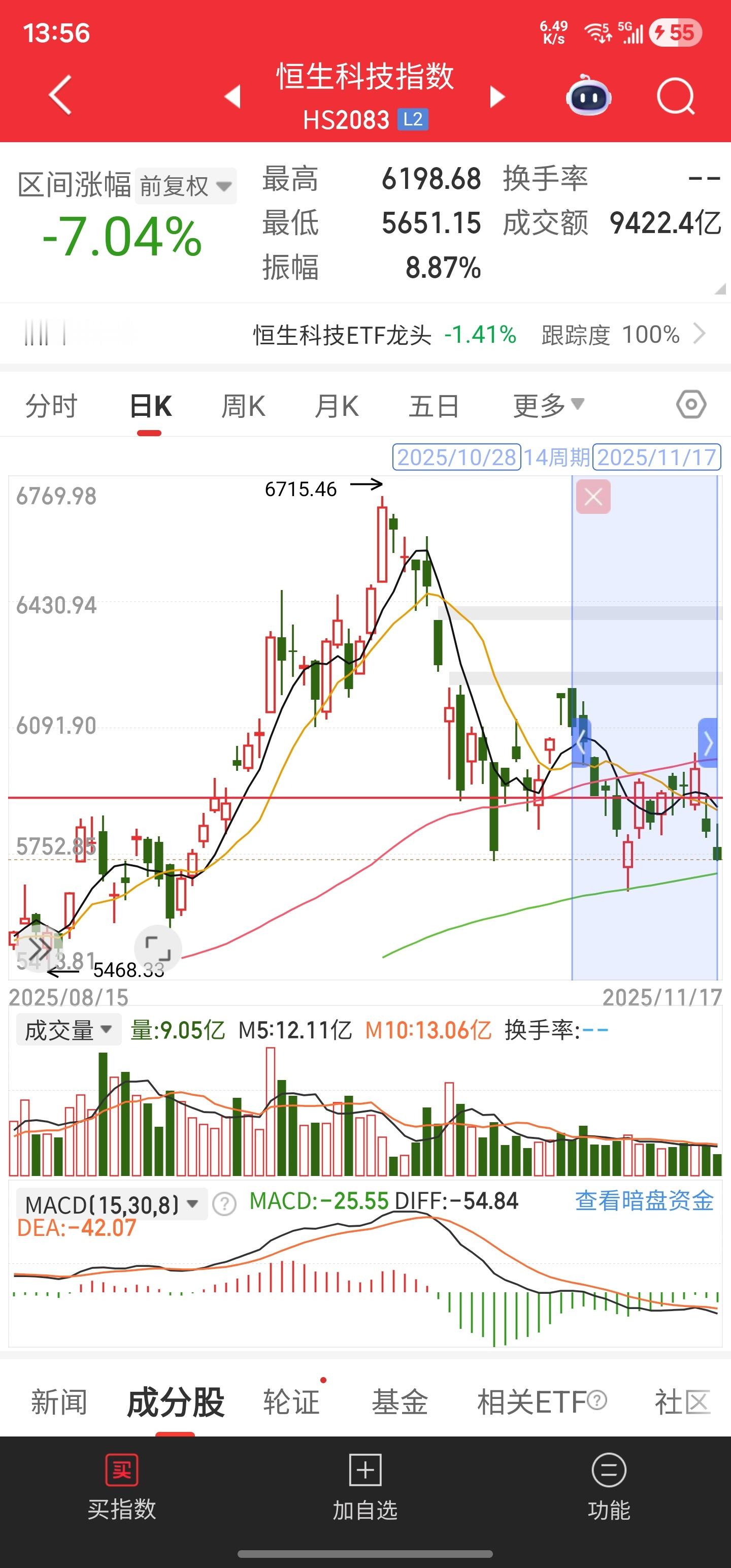 恒生科技指数,10月28日略过了一次止盈减仓,而跌到目前的位置也就是刚到上次接回的位置,所以我目前没有交易计划。如果是在10月28日已经波段减仓了的,那目前有了第二次差价,可以接回继续做波段。不用太烦恼会涨到哪里、跌到哪里,你只需记得目标就是“涨至同一个点位,比上次赚的多。跌至同一个点位,比上次亏的少”,所以做一些简简单单的交易就好了。