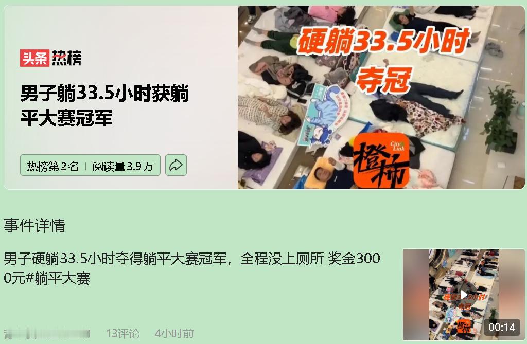 33.5小时躺赢3000块,你以为躺平很爽?其实背后全是当代人的情绪出口。 两百多人挤一块儿,不起身、不上厕所,靠玩手机硬扛。冠军拿了3000,围观网友却破千万,好多人喊“我能躺到过年”。但别急,这种“躺赢”,真没你想的那么轻松。 为啥有人愿意受这罪?说白了,是对高压生活的一种无声反抗。职场太卷,生活太累,躺下来好像就能暂时逃离一切。比赛里他们穿纸尿裤、点外卖、互相较劲——这不只是比赛,更像一场集体行为艺术,一群人在规则里找喘息。 可你以为你在休息,身体却在抗议。专家说,长时间不动会肌肉僵硬、血流不畅,甚至可能血栓。冠军33小时没上厕所,这种极限忍耐,真的值得吗? 更扎心的是,我们一边在屏幕前围观这场“躺平狂欢”,一边却控制不了自己的真实作息。报告说超一半的90后、00后习惯性熬夜,不是不想睡,是放不下手机,是被卷进“群体性睡眠拖延”。 所以啊,躺下去容易,站起来才难。别让“躺平”变成另一种逃避。真正的治愈,不是硬躺,而是找回生活的节奏感。你躺得再平,也躲不掉该面对的挑战——不如早点起来,把力气花在真正值得的地方。 生活不是比赛,不需要你硬扛,但需要你清醒地往前走。