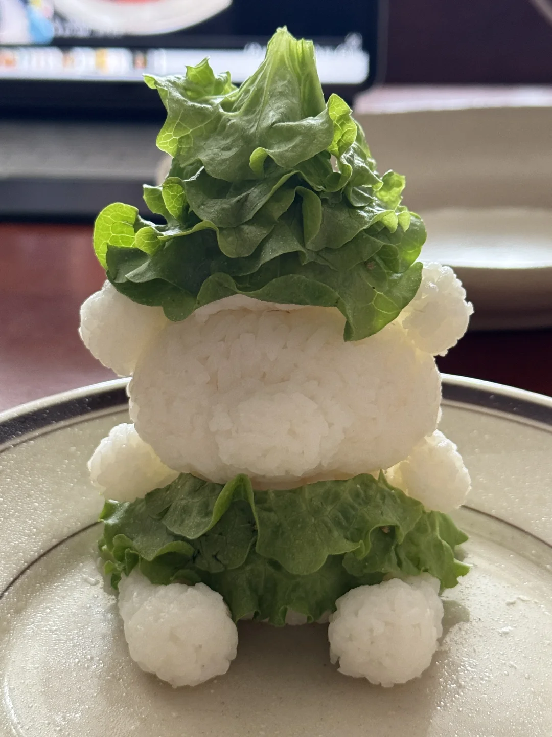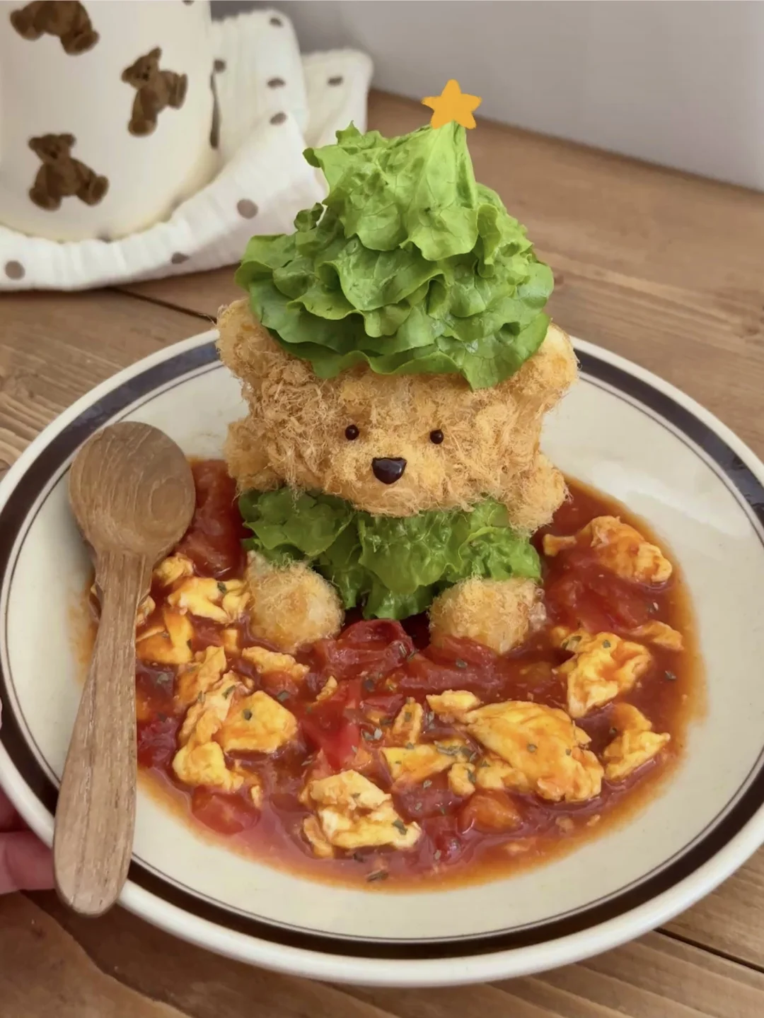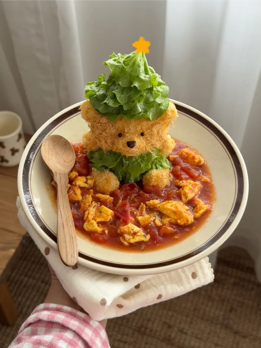 是一只藏在圣诞树里的小熊~ 还搭配了适合中国宝宝的番茄炒蛋✌️ - 材料:米饭、生菜、番茄、鸡蛋、肉松、沙拉酱 步骤: 1️⃣先用米饭捏出个底座,再捏出一只小熊的头头放在中间,上面再叠加一个尖尖,用生菜一圈圈的围在米饭上,中间的小熊头刷上沙拉酱,粘上肉松,用巧克力酱画上表情 2️⃣番茄切块,蛋液打撒后先把鸡蛋炒熟,盛起备用 3️⃣下番茄块炒到出汁,加少许生抽、白糖、清水、盐和番茄酱调味,盖盖焖个5分钟,出锅前下入炒好的鸡蛋,大火翻炒均匀收汁就OK啦