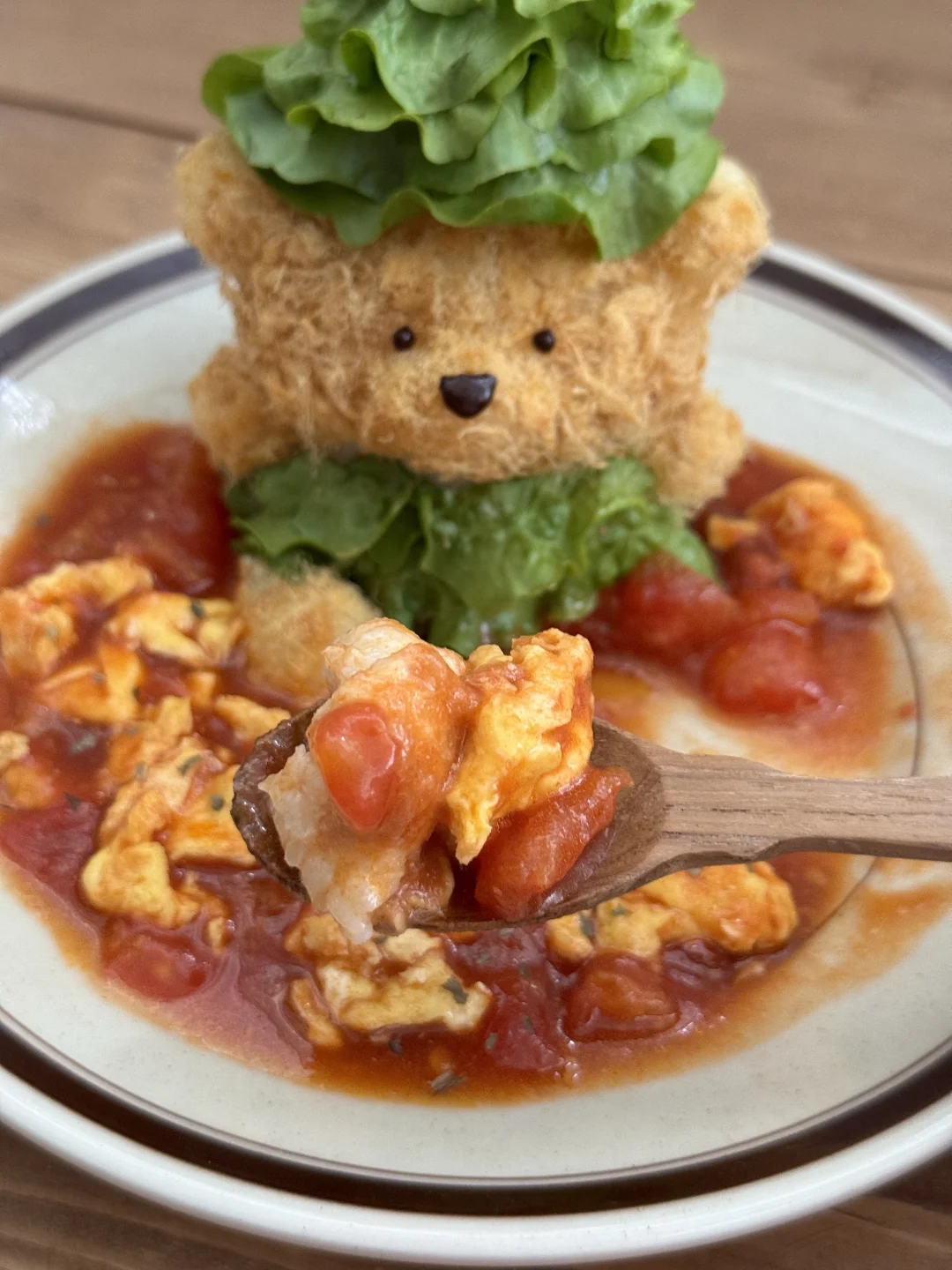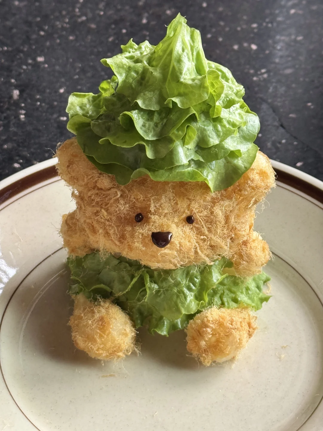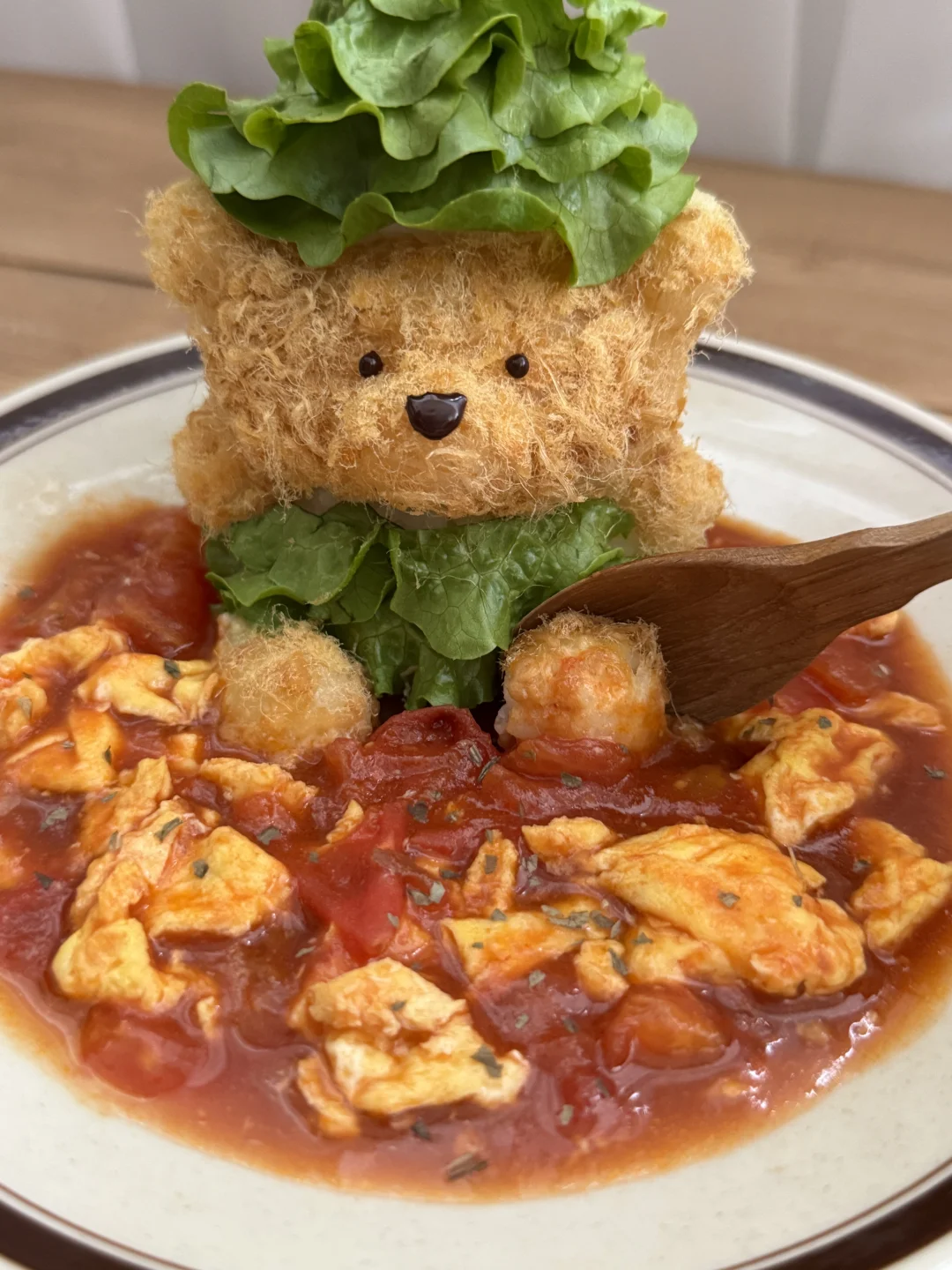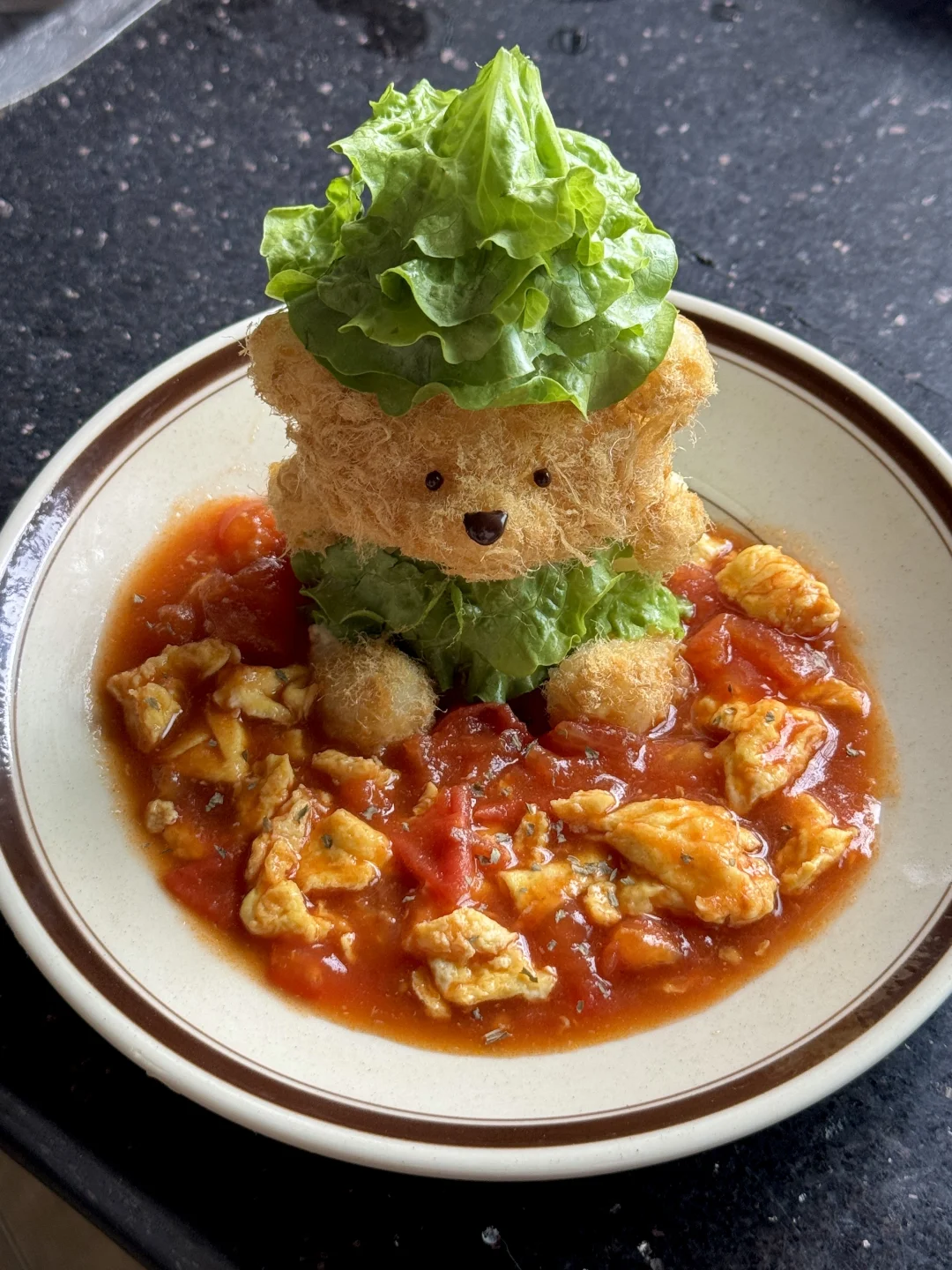 是一只藏在圣诞树里的小熊~ 还搭配了适合中国宝宝的番茄炒蛋✌️ - 材料:米饭、生菜、番茄、鸡蛋、肉松、沙拉酱 步骤: 1️⃣先用米饭捏出个底座,再捏出一只小熊的头头放在中间,上面再叠加一个尖尖,用生菜一圈圈的围在米饭上,中间的小熊头刷上沙拉酱,粘上肉松,用巧克力酱画上表情 2️⃣番茄切块,蛋液打撒后先把鸡蛋炒熟,盛起备用 3️⃣下番茄块炒到出汁,加少许生抽、白糖、清水、盐和番茄酱调味,盖盖焖个5分钟,出锅前下入炒好的鸡蛋,大火翻炒均匀收汁就OK啦