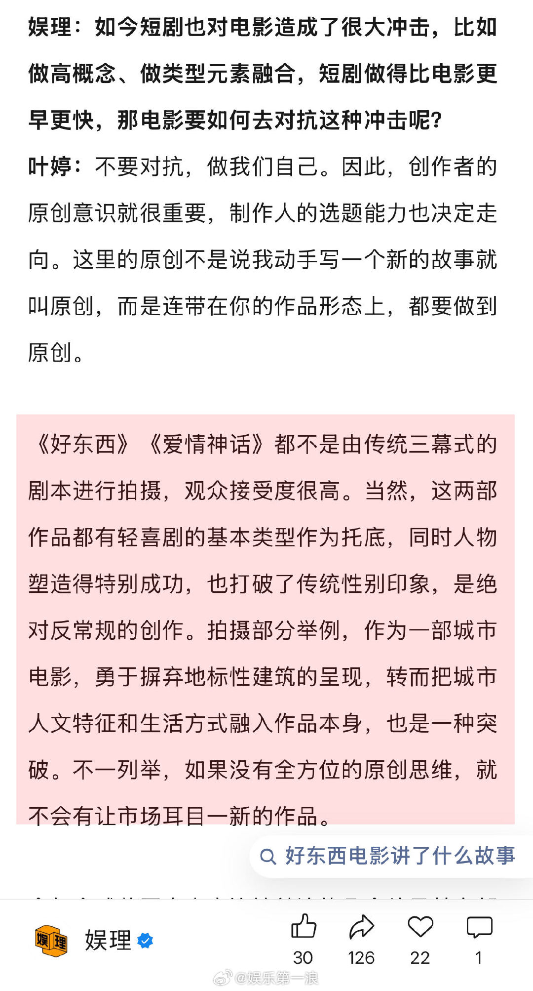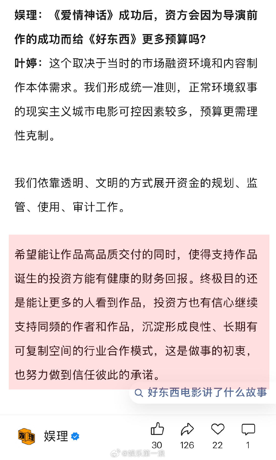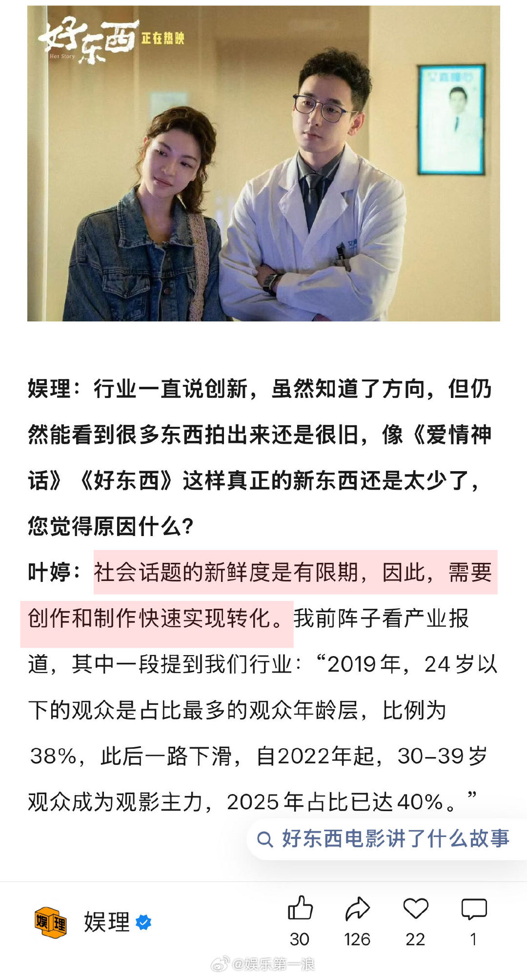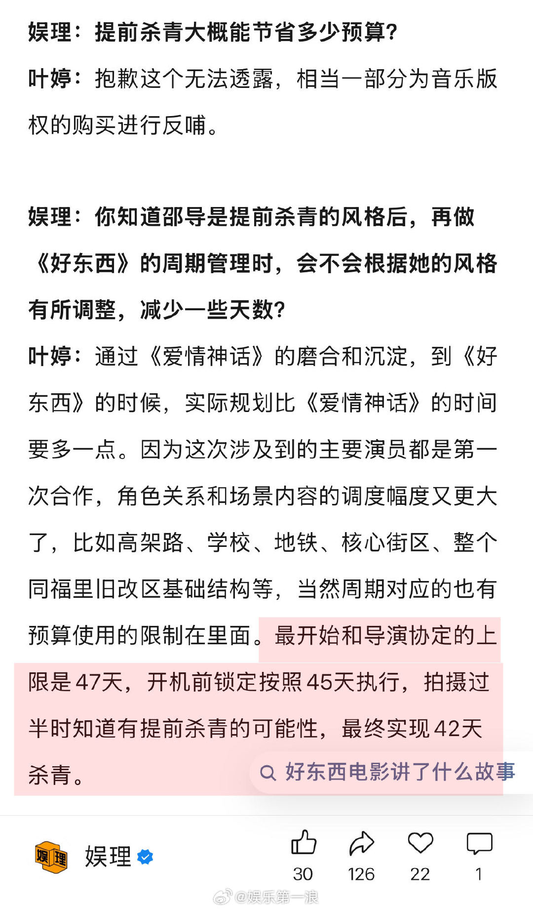 据制片人叶婷透露,《好东西》最开始协定的拍摄周期上限是47天,“开机前锁定按照45天执行,拍摄过半时知道有提前杀青的可能性,最终实现42天杀青。”在叶婷看来,剧组是临时组建的团队,要在最短的时间里面统一动作直达目标,挺考验团队创制水平的。“机会和资金都是稀缺资源,年轻创作者要获得持续发展的机会,交出的成绩单里效率和品质缺一不可…”↓