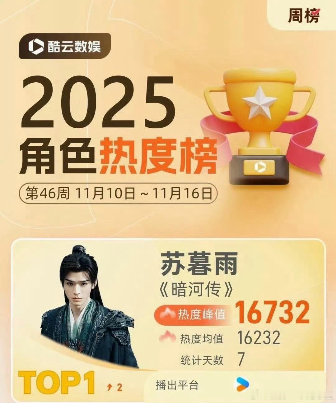 龚俊暗河传苏暮雨拿下最新一周角色热度周冠,恭喜!