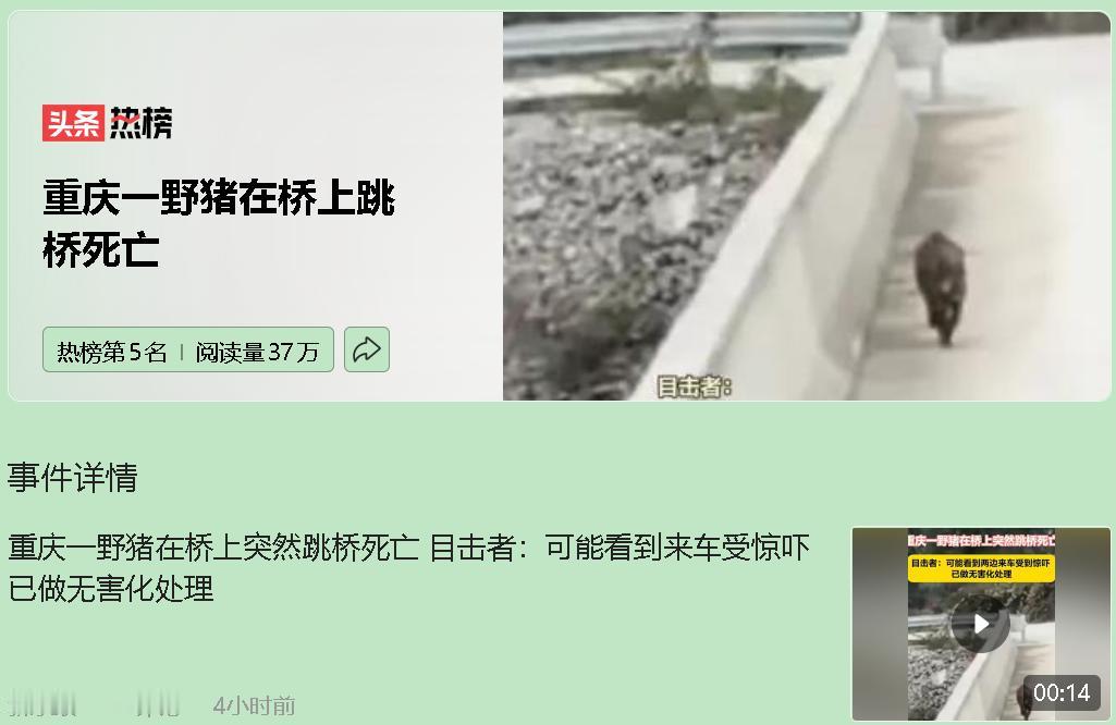 看到野猪被逼跳桥的新闻,真的破防了!好端端的它,竟被两辆车夹击,最终从20米高桥一跃而下…明明可以活着,却选择了最绝望的方式。 表面是猪跳桥,实则是人类逼的。 它原本在附近吃庄稼,被货车吓到逃上桥,结果前后被堵死。平时连无人机都抓不住的野猪,那一刻得多害怕,才会选择“自杀”? 真相太扎心: 一边是各地悬赏捕杀野猪,一边是无辜的它们因人类扩张无家可归。我们砍森林、修大桥,却问野猪为啥闯进城? 与其一味猎杀,不如想想怎么共存:装防护网、留生态走廊、管好狩猎工具…科技不该只是武器,也能成为保护的力量。 说到底,野猪不会说话,但它的死是一种抗议。咱们开荒拓土时,能不能也给野生动物留条活路?毕竟地球,从来不只是人类的啊。