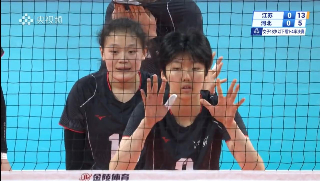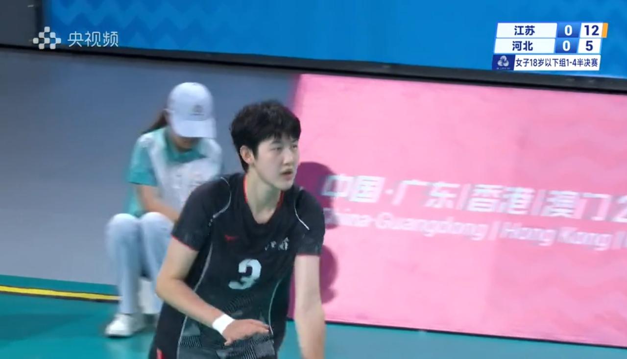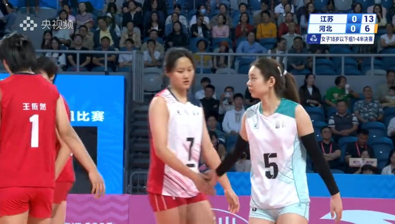 [U18女排全运会]半决赛:江苏——河北 实时战况: 17日下午16:30,全运会U18女半决赛江苏——河北的比赛准时打响。第—局开始,15:6,江苏领先。17:6,17:7,20:9,江苏一路领先,21:9,22:9,22:10,河北快攻。23:10,24:10,江苏拦网。25:10,魏伊杉扣球得分。江苏胜第—局,大比分1:0,江苏领先! 第二局比赛正在进行中……