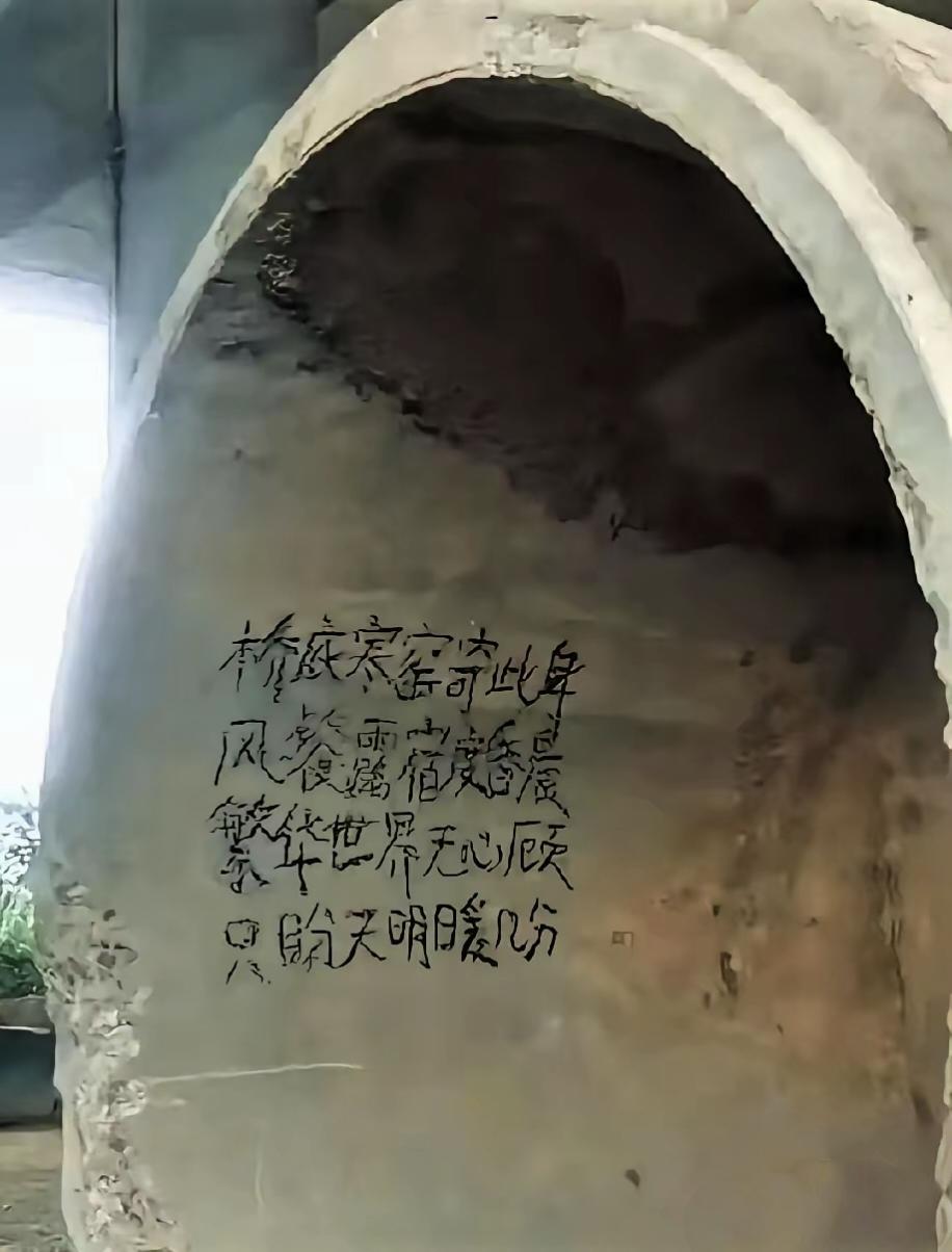 桥底寒窑寄此身 风餐露宿度晨昏 繁华世界无心顾 只盼天明暖几分 ——短短四句,把流浪汉的处境和心境写透了。桥洞的墙皮斑驳,几行黑字歪歪扭扭,却是一个流浪汉的‘生存日记’。 ‘桥底寒窑寄此身’,第一句就戳心:他把桥洞当‘家’,可这‘家’连寒窑都不如,是风一刮、雨一浇就透的角落。‘风餐露宿度晨昏’,日子是掰着时辰熬的——饿了随便啃点东西,困了裹着寒气躺一夜,一天又一天,没个头。 最让人心酸的是后两句:外面的高楼、热闹,他不是看不见,是‘无心顾’——那些繁华跟他没关系,他连下一顿饱饭都摸不着,哪有心思看世界?他唯一的盼头,就只是‘天明暖几分’——等太阳出来,能稍微晒热点,这就是一天里最像样的‘希望’了。 咱们平常抱怨‘生活难’,可能是加班、堵车;可对他来说,生活是‘活着’本身。这几行字不是诗,是把‘苦’写在了墙上——希望真的能有更多人看见,给这些在桥洞里熬日子的人,多递一点暖。”