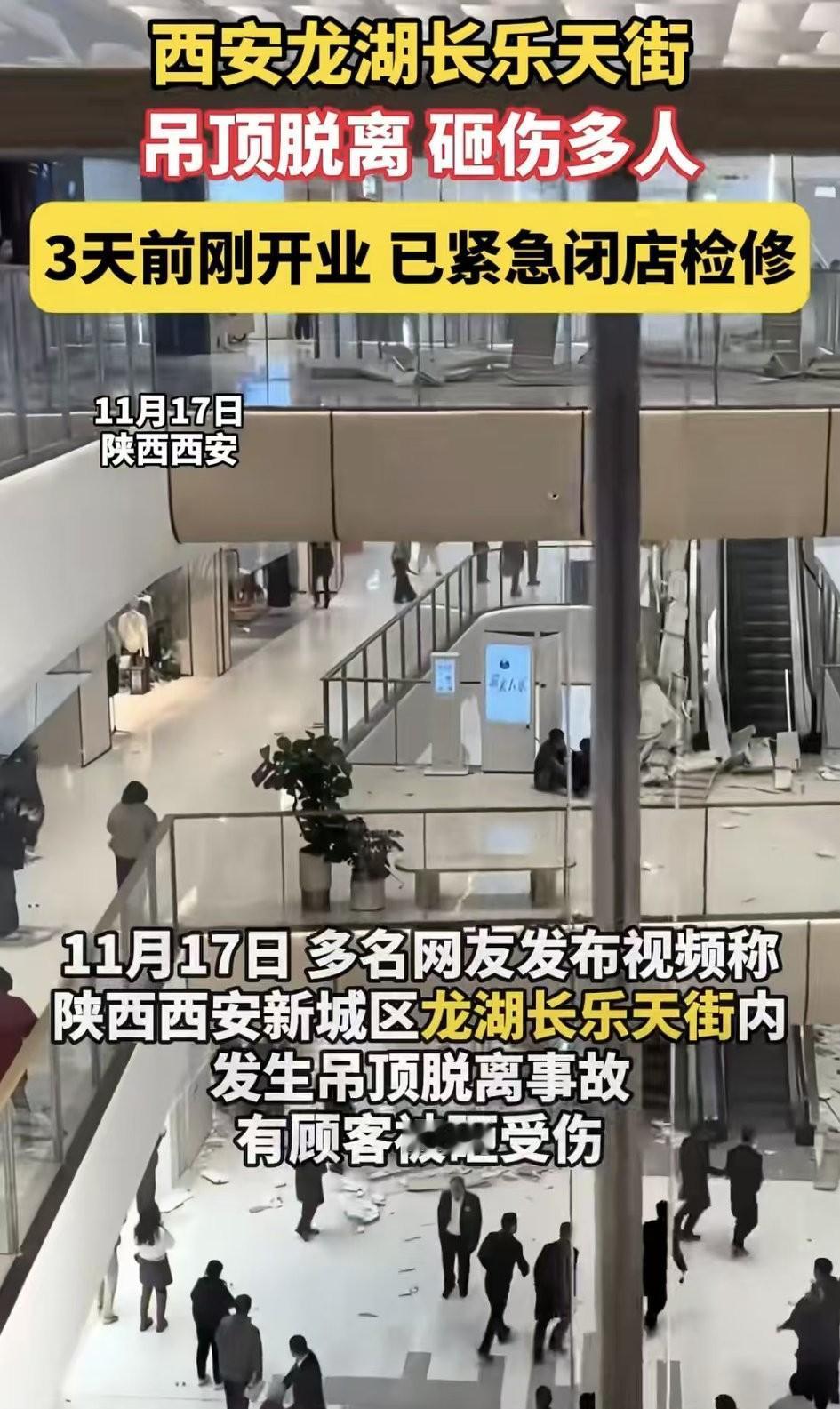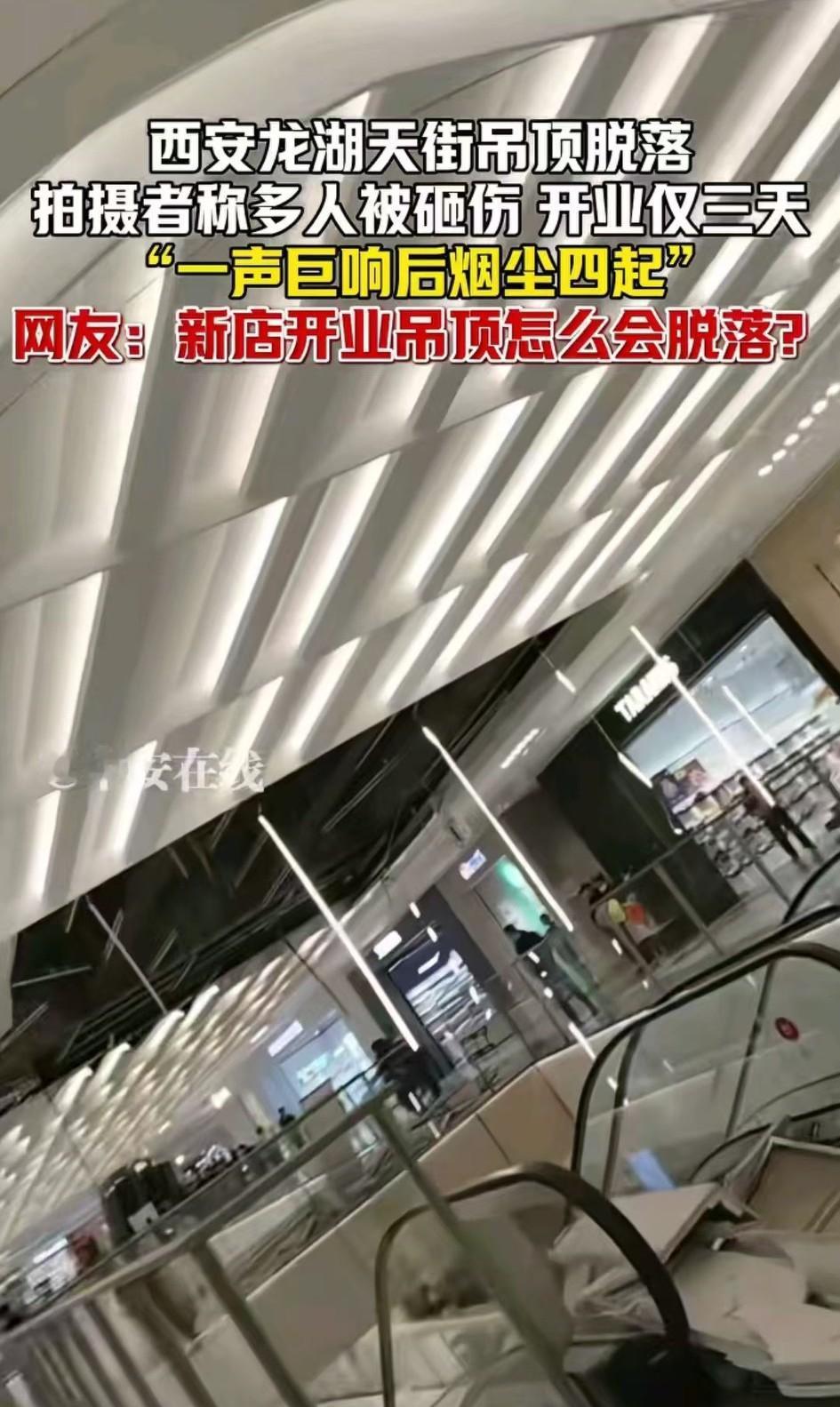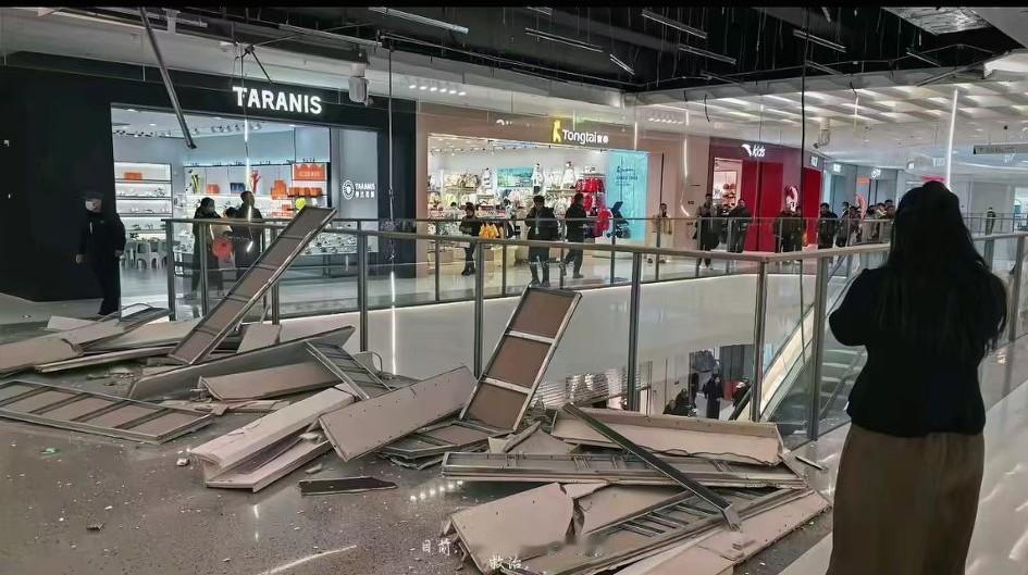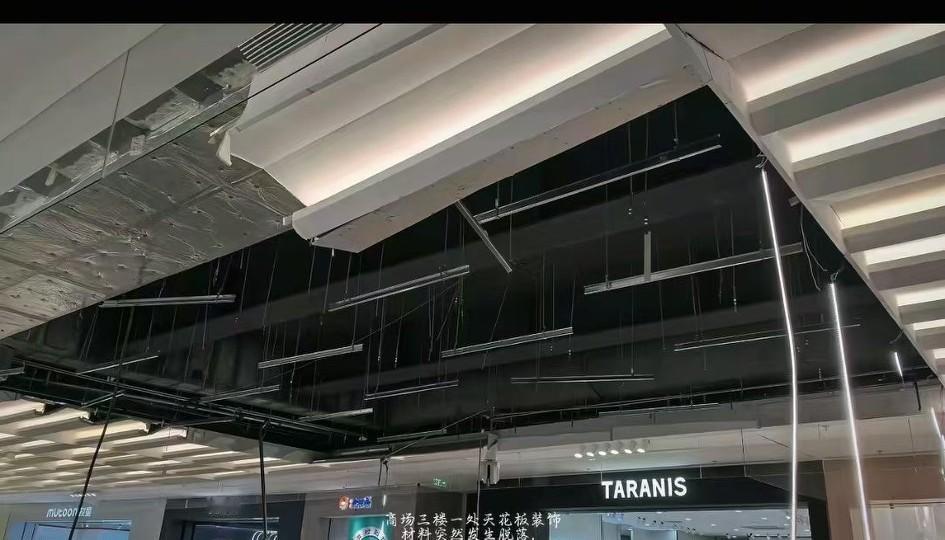 干过装修的师傅一看这房顶就知道这工期得有多急,现在只能庆幸吊顶事故不是发生在周末,假日商场里的人更多啊! 顶部到吊顶目测得2米以上距离,没看到反向支撑和转换层。吊筋超过1.5米,遇到共振后,拉力不足就会掉下来。 波浪形的造型顶,用的猫爪卡子,受重也不行啊! 工程款应该是拿不到的,监理、施工、总包、分包、验收的,都睡不着觉了。 好好检查一下别的地方,仔细排查一遍,看看还有没有其他安全隐患吧!