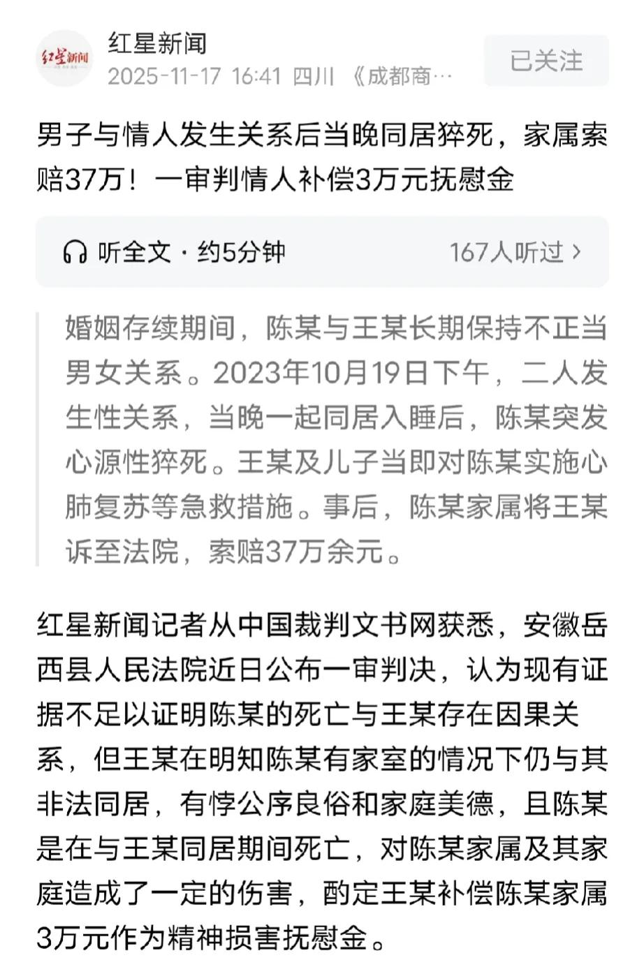 安徽安庆,女子把情人带到租房,跟他发生关系后,当晚两人相拥而眠,谁料,半夜12点,女子醒来发现情人口吐白沫、翻白眼,脑袋耷拉着,怎么叫都不应,女子吓坏了,赶紧叫醒她儿子,母子俩轮流给情人做人工呼吸、心肺复苏,并拨打急救电话,可情人被送医后还是不治身亡,家属告上法庭,向女子索赔37万,法院判决让人意外。 据报道,陈先生和他的妻子关系一直不好,两人结婚多年,但是矛盾不断,不过他们并没有因此分开,可能是为了孩子,也可能是因为别的原因。 虽然陈先生和妻子没有离婚,但是他早已在外有人,他跟王女士长期保持着不正当男女关系。 陈某的妻子知道后,曾经跟他吵、闹,但是陈某并没有因此而收敛,依然经常跑去找王某。 2023年1月份,陈某的妻子无意中听说陈某给王某转了30多万元。 陈某的妻子气不过,告到法院,她认为陈某转给王某的钱是夫妻共同财产,要求王某全部返还。 不过,当时法院经过调查审理,并没有证据证明陈某转给王某30多万,只是查到陈某给王某转了3万3。 当时法院的判决是,这3万3是陈某夫妻共有财产赠与无效。 王某被陈某妻子告了之后,她和陈某之间的关系更加透明,陈某有事没事就往王某家跑,似乎两人才是真正的夫妻。 陈某妻子见管不住陈某,索性不管了,任由他在外面疯。 但,谁也没料到,报应来得那么快。 2023年8月份开始,陈某搬到王某租住的房子跟她同居生活,两人宛如真正的夫妻,你侬我侬,小日子甜蜜又温馨。 可这样幸福的日子并没有持续多久,2023年10月6号到10号,陈某反反复复发烧感冒咳嗽,王某带着他到某诊所看病打针。 谁料,刚好转一周,到10月18、19号,陈某再次出现感冒症状,王某不得不陪着他再次到诊所打针。 19号那天早上,陈某从诊所看病回来,感觉人精神了很多,好像病也好得差不多了。 19号下午,陈某抱着王某要求跟她发生关系,王某没有推脱,两人恩爱一番后,带着满足感相拥而眠,睡了一下午后,才起床。 晚上9点多,陈某去冲凉,王某给他拿衣服的时候,突然发现,王某双腿发软,不停地颤抖,王某问他要不要紧,需不需要去医院看看。 陈某摆手回答她说,不用去医院,可能是感冒后遗症,休息一下应该就不碍事了。 洗漱完毕,大概10点多,两人就睡觉了,一直睡到凌晨12点左右,王某突然听到怪异的鼾声,她瞬间被吓醒,再仔细一听,她发现那怪异的鼾声是陈某发出来的。 王某赶紧打开床头灯,她发现陈某侧躺在床上,脑袋在枕头上耷拉着,嘴角流着口水,还不停翻白眼。 王某吓得赶紧大喊陈某的名字,可他毫无反应,王某吓得赶紧跑到儿子房间,喊他来援助。 母子俩对着陈某又是人工呼吸又是做心肺复苏,王某也不忘打120急救电话。 可无论母子俩怎么折腾,陈某都毫无反应,不久后,120急救人员赶到王某家,他们经过检查告诉王某陈某已经死亡。 王某真不敢相信医生所说的,她没想到生命这么脆弱,不过医护人员最终还是把陈某送到医院抢救。 陈某被送到医院急救后,医生进行第三次心电图检测,最终告知王某,陈某已经死亡。 医院出具的死亡医学证明书显示,陈某死因为心源性猝死。 王某赶紧拨打110报警电话,警方通知了陈某家属。 事后,陈某家属把王某告上法庭,向她索赔37万元。 陈某妻子说,当天不知道是陈某要求同房还是王某主动要求,她说陈某身体一直不好,之前做过胰腺炎手术。 王某说是陈某要求的,她也知道陈某做过手术,她跟陈某交往的过程中发现,陈某总是一副病殃殃的样子,他经常腹痛还伴有甲亢,常年吃药。 法院审理后认为,陈某本身做过胰腺手术、之前还感冒发烧过,死因是心脏猝死;而且王某发现他发病后也救了,陈某自己该对身体状况有数。所以,没有证据证明他的死和王某有关系。 不过,毕竟陈某发病时只有王某母子在身边,而且王某明知他有老婆还和他同居,这事不道德,也确实让陈某家属难受。所以,法院按相关法律,让王某给家属赔偿3万块精神安慰费。 那么,从法律角度如何看待这件事呢? 《最高人民法院关于确定民事侵权精神损害赔偿责任若干问题的解释》第1条,因人身权益或者具有人身意义的特定物受到侵害,自然人或者其近亲属向人民法院提起诉讼请求精神损害赔偿的,人民法院应当依法予以受理。 本案中,陈某家属主张精神损害赔偿的基础是陈某死亡对其造成精神痛苦,但法院并未认定王某的行为与陈某死亡存在因果关系,因此不构成“侵害人身权益”的侵权责任。 不过,法院同时考量王某明知陈某已婚仍与其非法同居的行为违背公序良俗,且陈某在与王某同居期间死亡,该情形虽不直接构成侵权,但客观上对陈某家属造成了精神伤害,符合该解释中“人身权益受侵害”的扩张性考量。 所以,法院酌定王某补偿3万元抚慰金,既未支持家属37万的高额索赔,也对王某的不当行为作出了符合公序良俗的责任评价。 对此,大家怎么看呢?@猫眼学法
