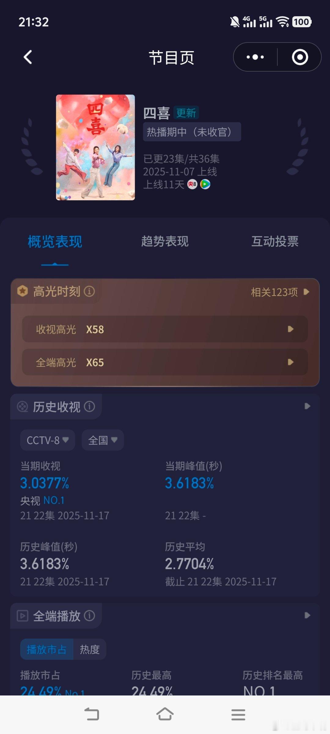 《四喜》收视再创新高!今晚峰值3.6183,平均3.0377,双数据新高!cvb估值:3.0377×0.82=2.491按照这个走势有望冲击年季!