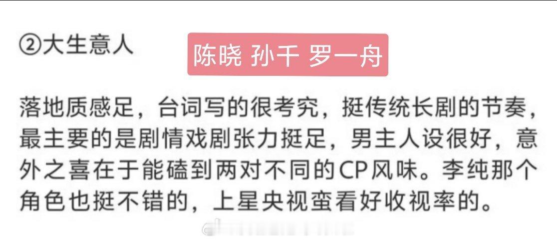 马上要播的几部剧的repo,看看这次业内会不会翻车迪丽热巴、陈星旭《枭起青壤》:有cp感,有的地方滤镜有点狠,有些人过于npc,需要沉浸式看剧陈晓、孙千、罗一舟《大生意人》:传统长剧风,台词考究,男主人设好宋威龙 赵今麦《骄阳似我》:男女主cp感很好,节奏不错,超出预期