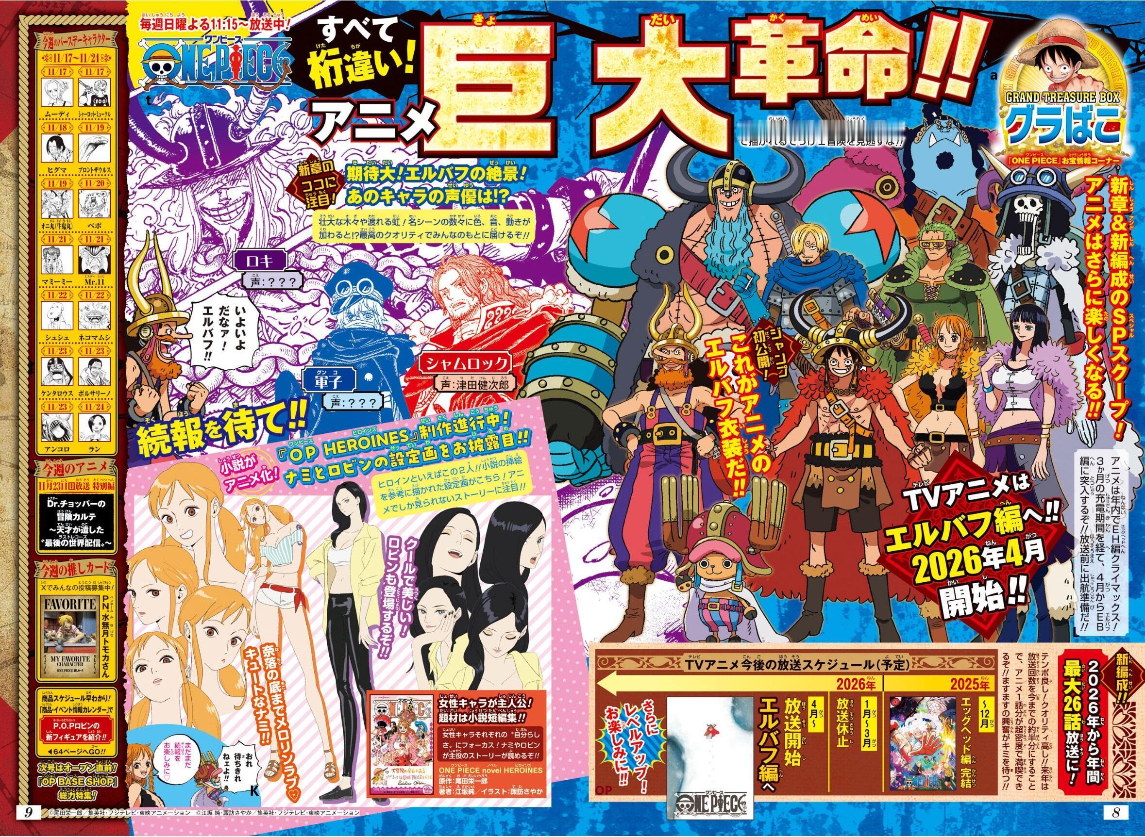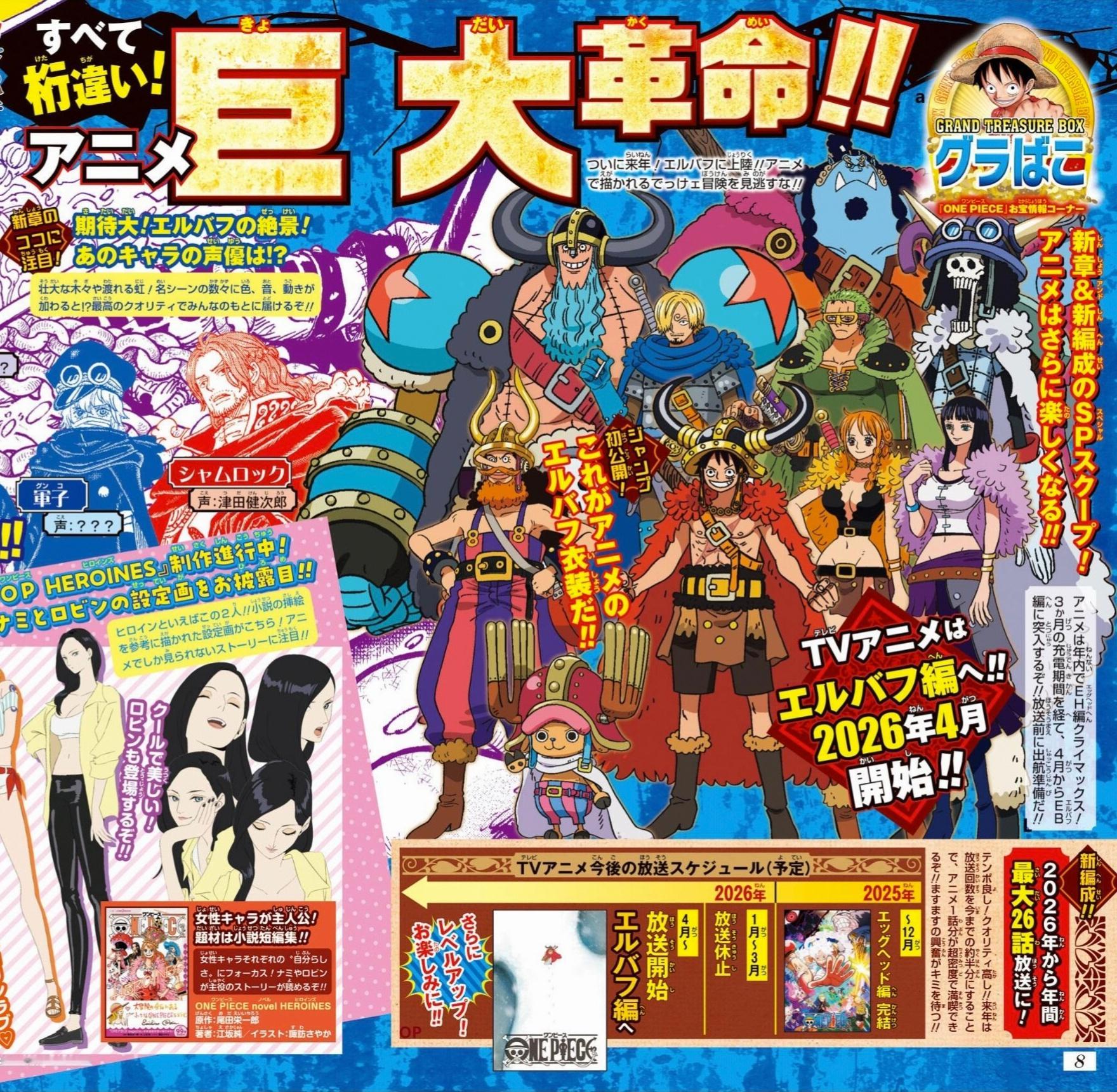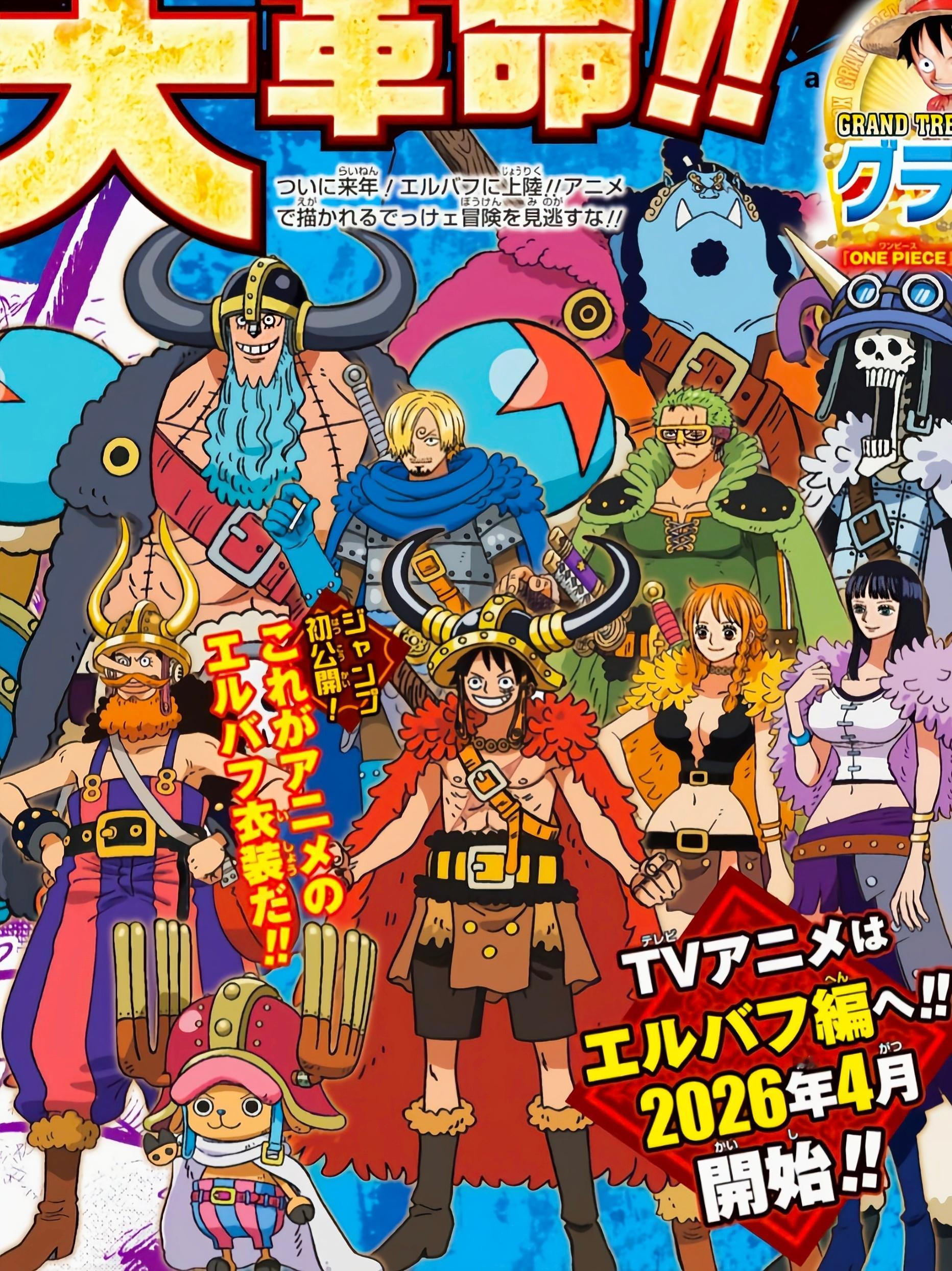 海贼王动画巨大革命开启!改成季播了!!新篇章艾尔巴夫篇官方报道图!草帽一伙设定大合照来了今年年底蛋头岛篇完结【明年起每年最多只有26集】2026年1~3月停播!!!4月开始播出海贼王艾尔巴夫篇动画。海贼王女主角小说改编动画的设定图。